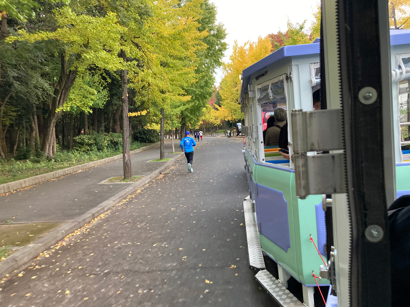 森ノ宮駅から極楽橋駅まで、思ったよりも長い距離を走ってくれる。公園の敷地内をゆっくり進むのだが、周りには散歩している人やジョギングをしている人が大勢いて、その脇を併走する感じで面白い。