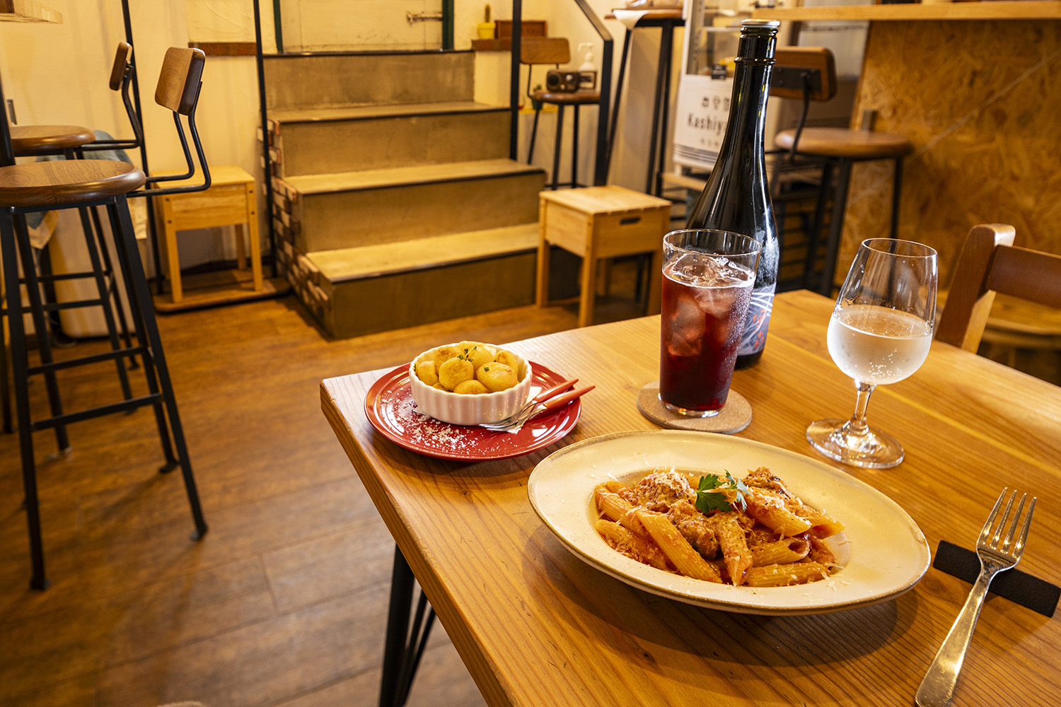 扉を開けば小さな地下空間。菓子職人の中村文さんが好きなお酒を洋菓子やおつまみと共に提供したいと2024年に開店。「基本、夕方から開くのでお仕事帰りにケーキを買いに寄られる方も多いです」。料理はイタリアン系で、ニョッキはやみつきになるモチモチの弾力。日本酒やリキュールのラインアップも目が離せない。