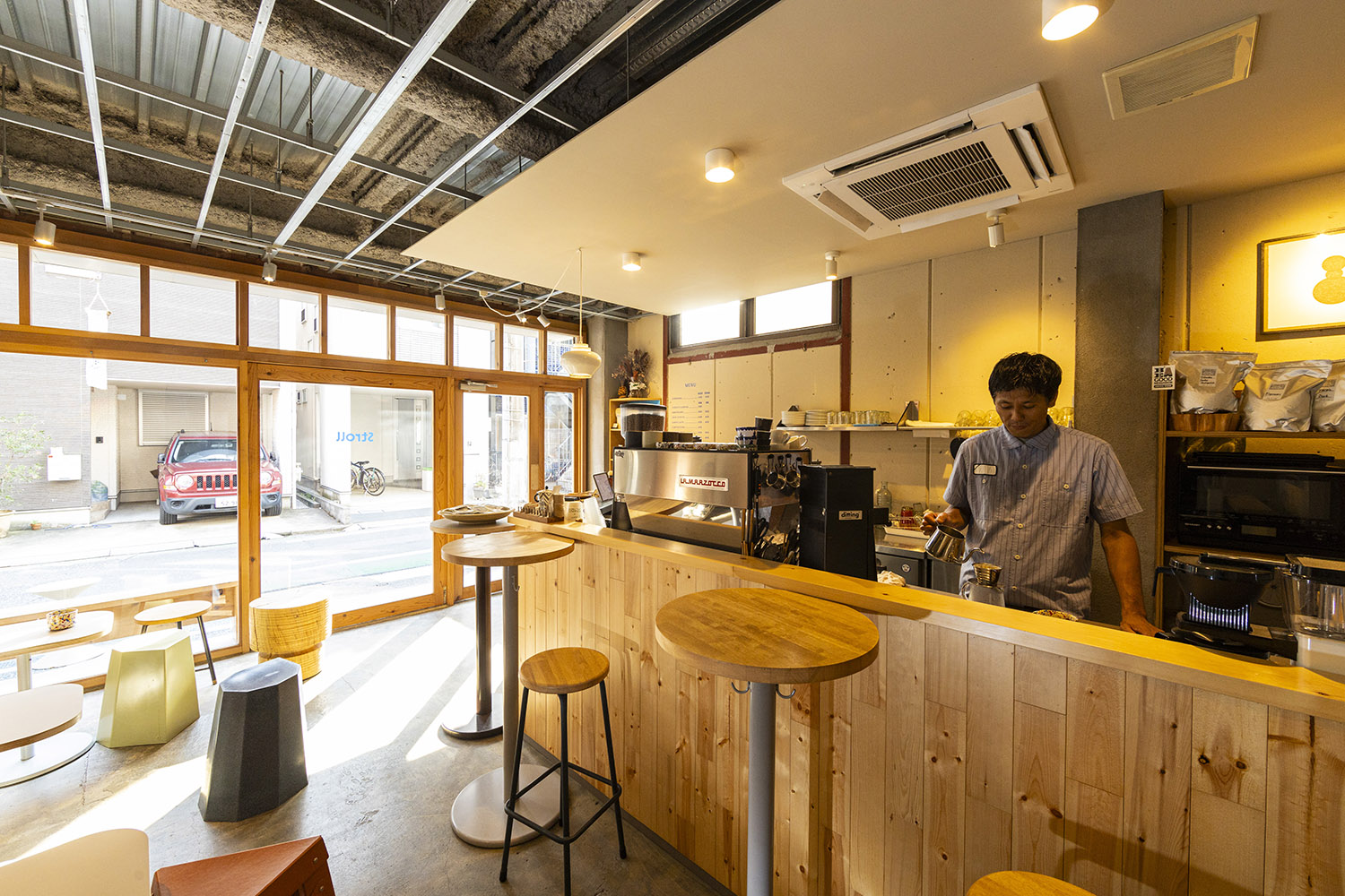 一面ガラス張りの開放感が心地よい、スペシャルティコーヒーの店。デザインも配置もバラバラな椅子は、「そのときの気分で席を選んだり、自由に使ってもらいたくて」と店主の新貝勇介さん。さりげないアートやBGMにもこだわりを感じずにはいられない。自家製スコーンにアイスクリーム、ボリューム満点のホットドッグなど、コーヒーのお供も充実。
