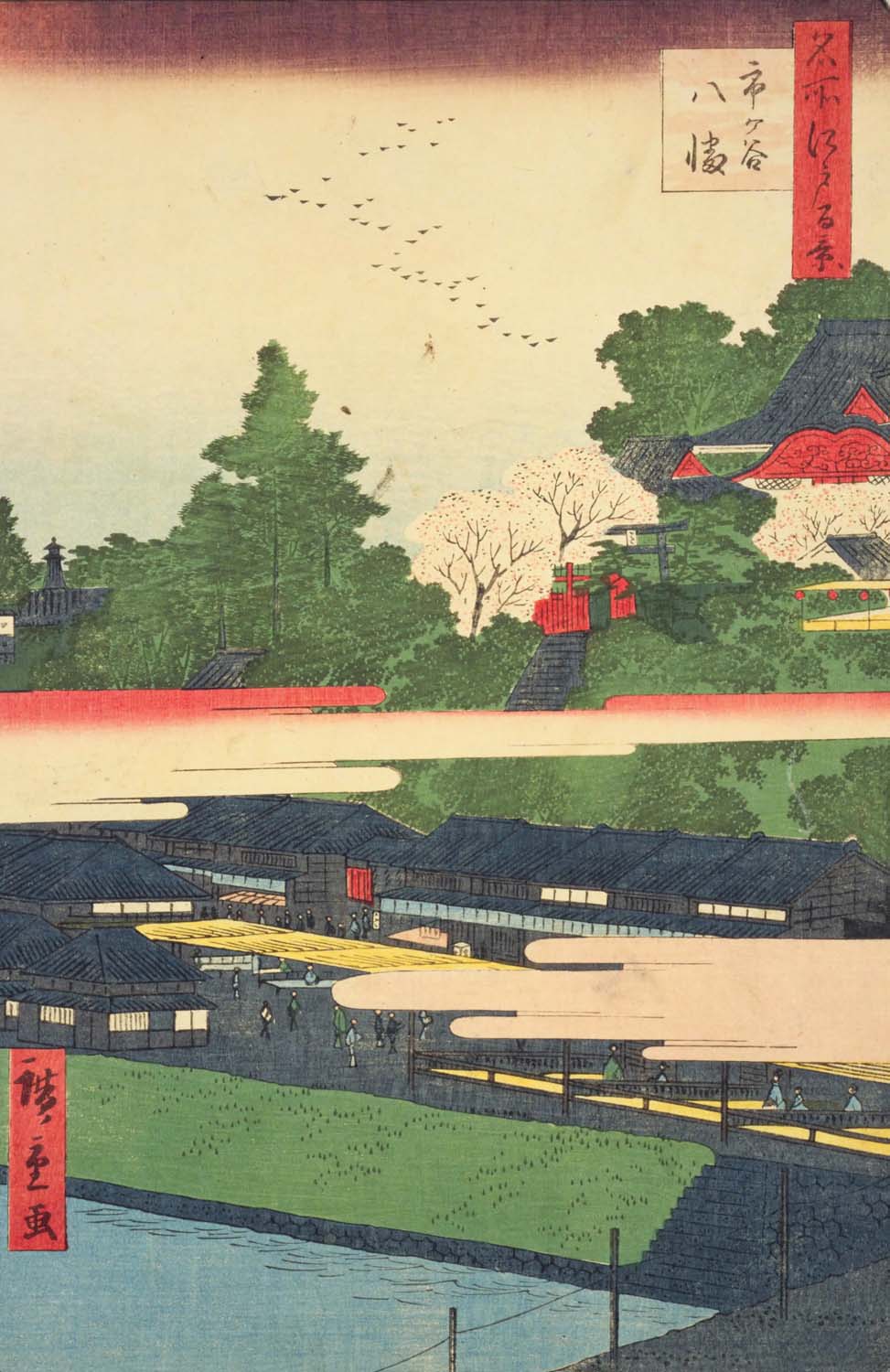 錦絵に描かれた市谷八幡宮は、「尾張殿」の左端に隣接。桜の名所でも知られ境内には茶屋や芝居小屋が並びにぎわった。切絵図下方の「神楽坂」は江戸城牛込門に通じる交通の要所だった。