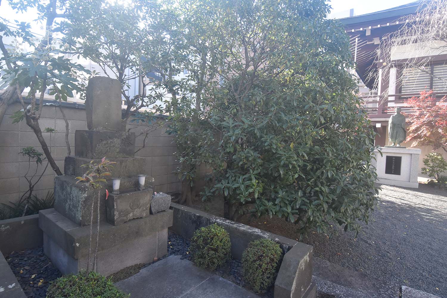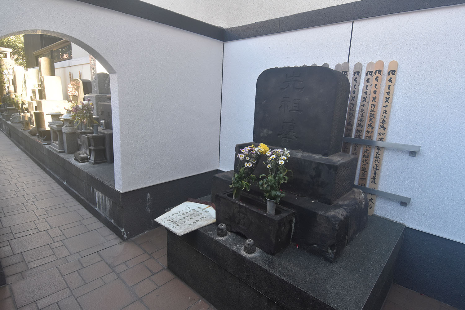 本堂に向かって左側に、ひとつだけ大きな墓石が建っているのが目に入る。それは多くの弟子を育てた浮世絵師、勝川春章(しゅんしょう)のもの。役者の顔をリアルに描くことで、勝川派と呼ばれた一大勢力を築き上げた。あの葛飾北斎も弟子のひとり。