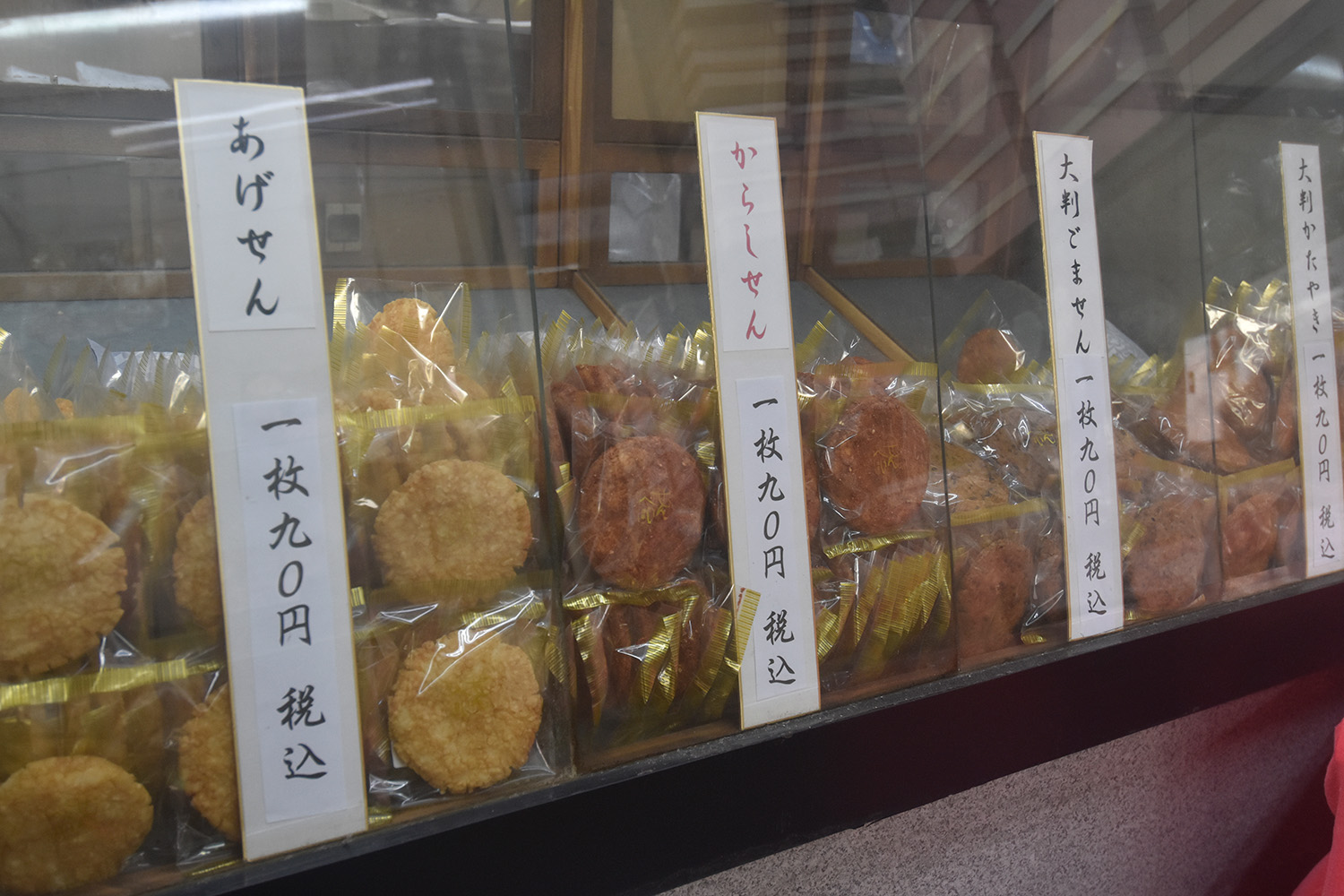そこに救世主のように現れた(正確には自分から近付いて行ったのだが……)のが、どれも“おいしいにきまっているよ”というたたずまいを放つ、昔ながらの煎餅が並ぶ『鳥越せんべい加賀屋』だ。店構えから商品ケースまで、郷愁をそそられる造り。