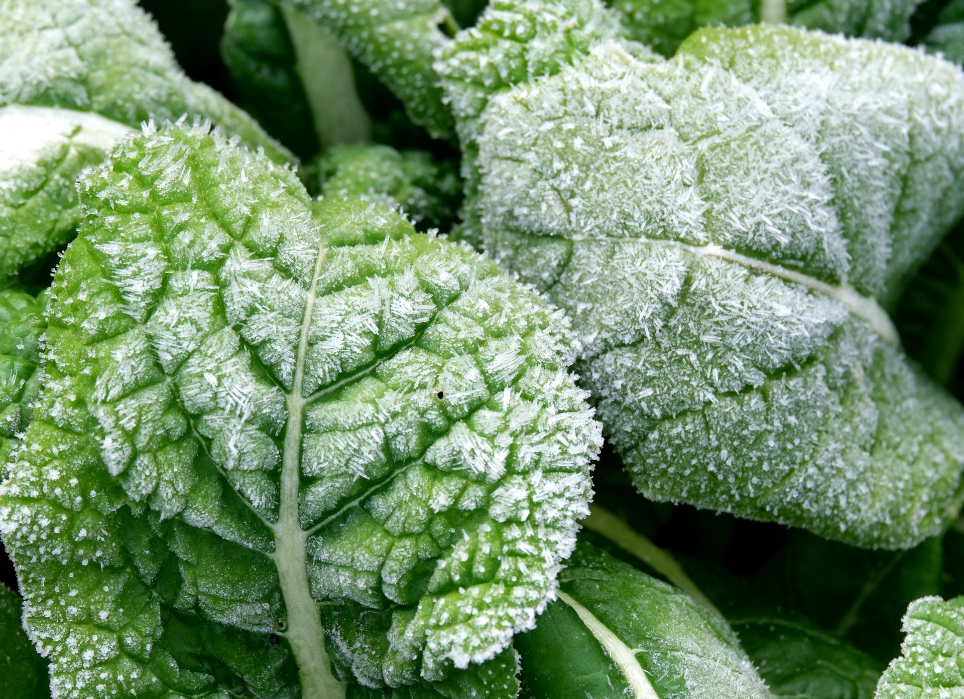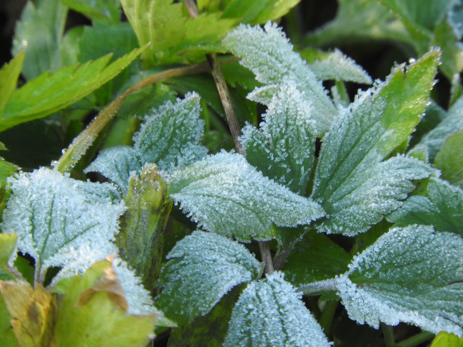霜が降りる目安は、天気予報で最低気温が3~4℃くらいと予想される時です。この気温は地上1.5m程の高さで、地面付近では0℃近くなるので空気中の水蒸気が凝華して氷になります。地面に近い葉っぱなどをよーく見てみてください。スマホ用のマクロレンズを付けるときれいに撮影できます。気温や水蒸気の量によって霜の形が変わるのもおもしろいです。