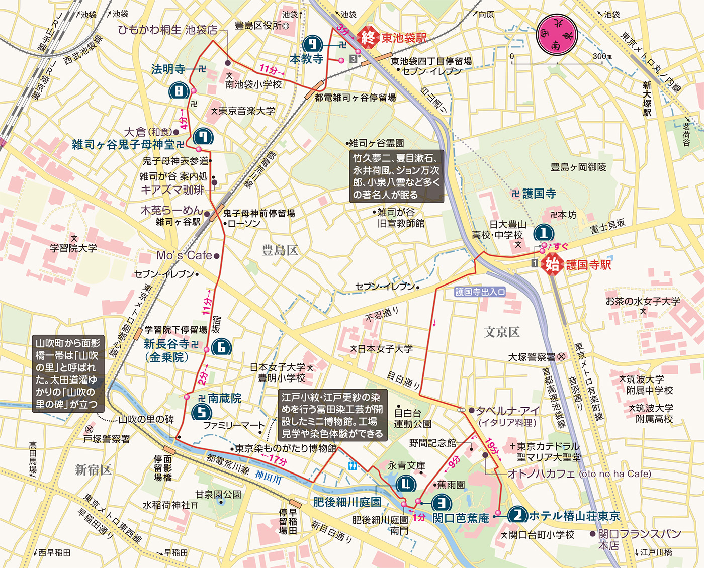 地下鉄有楽町線護国寺駅→(すぐ)→護国寺→(19分/1.3㎞)→ホテル椿山荘東京→(9分/0.6㎞)→関口芭蕉庵→(1分/0.1㎞)→肥後細川庭園→(17分/1.1㎞)→南蔵院→(2分/0.2㎞)→新長谷寺(金乗院)→(11分/0.7㎞)→雑司ヶ谷鬼子母神堂→(4分/0.3㎞)→法明寺→(11分/0.7㎞)→本教寺→(3分/0.4㎞)→地下鉄有楽町線東池袋駅