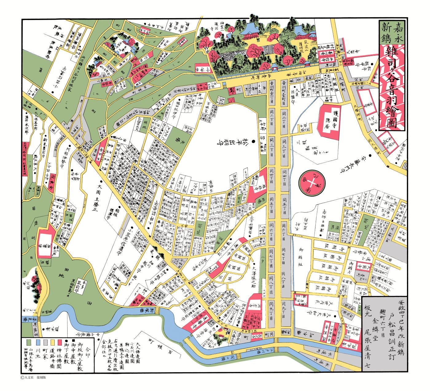 ※切絵図内の白色の部分は【大名屋敷などの武家地・御用地】、赤色は【神社仏閣】、灰色は【町屋】、黄色は【道】、青色は【海・川・池】、緑色は【山林・土手・馬場・田畑など】を示している。