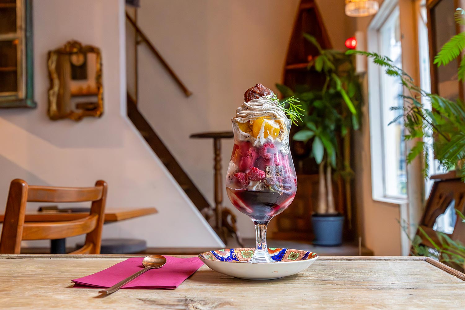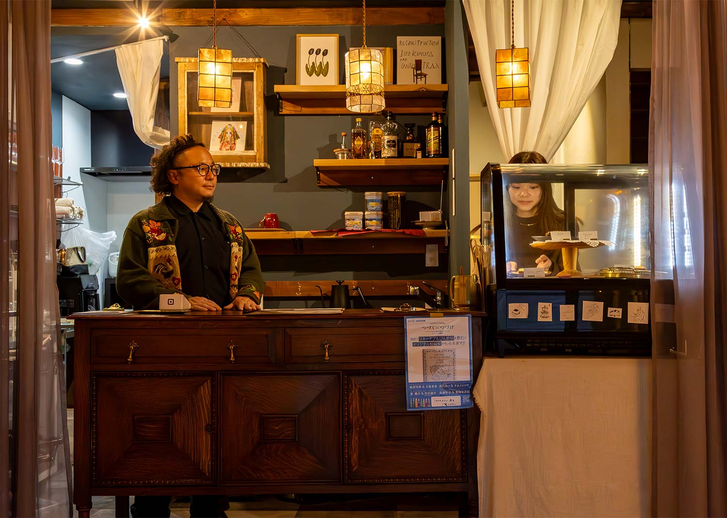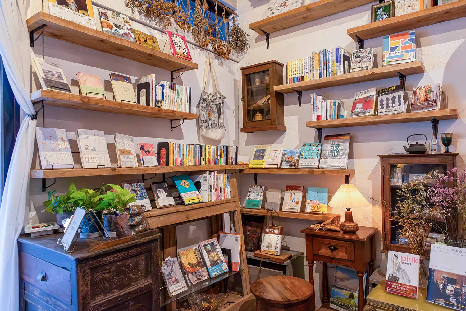 1階はふらっと立ち寄れるブックカフェ。旅や街歩きエッセー、短編小説など書籍の販売もあり、「短い時間でも、非日常を味わってもらえるような選書を心がけています」とオーナーの西尾吉朗さん。2階は予約制の図書喫茶室。ヨーロッパや京都のビンテージ家具や雑貨、本に囲まれて、プライベートな時間が過ごせる。著者を招いたトークイベントやアーティストの個展なども開催。