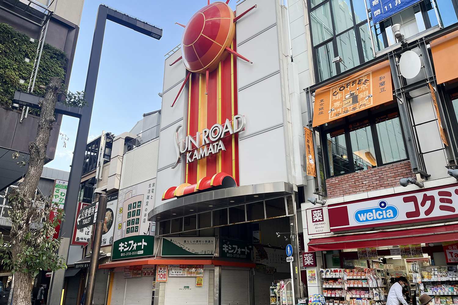 JR蒲田駅西口を出ると目につく、大きな太陽モチーフの門。それがまさに、蒲田西口商店街サンライズの入り口だ。出題写真を撮影したのが朝9時半ごろで、まだシャッターが閉まっている店も多いのだがご容赦いただきたい。