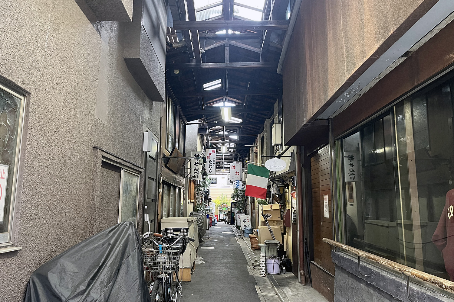 木造とおぼしき天井は三角屋根で、梁が渡された造形も美しい。照明や採光窓もあるものの、どうしてもちょっぴり薄暗い感じがまたこの雰囲気に一役買っている。目をひくイタリアの国旗は、2023年の『散歩の達人』谷根千特集にも登場したイタリアンバール『nenecolo』のもの。