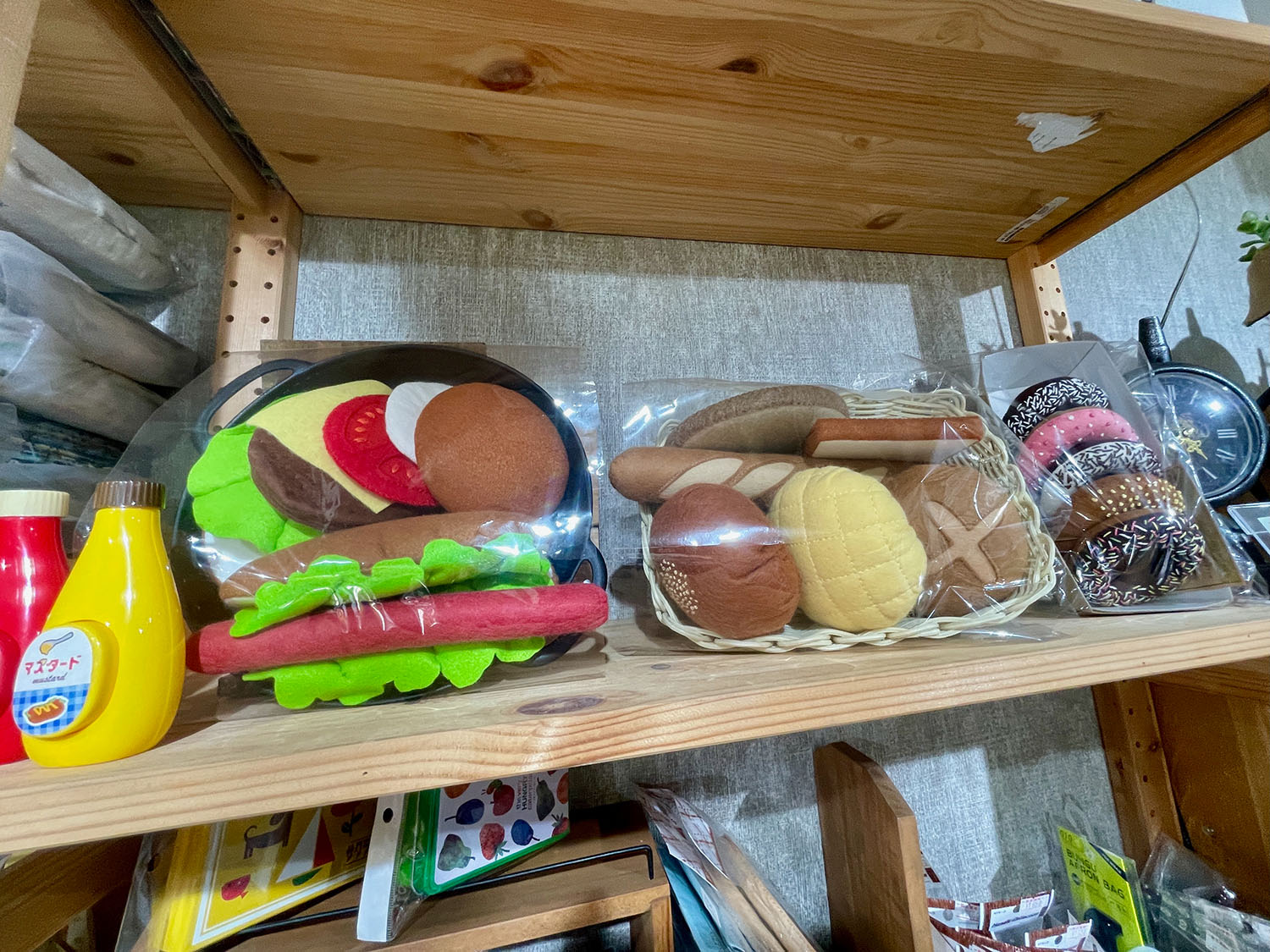 「家にいて暇な時に、母(敬子さん)がフェルトのキットをくれて、フェルトでいかにリアルに食べ物を表現するかという楽しみにハマって」と智子さん。指差した先の棚には、その頃から作り始めたというドーナツやパンのフェルトおもちゃがありました。