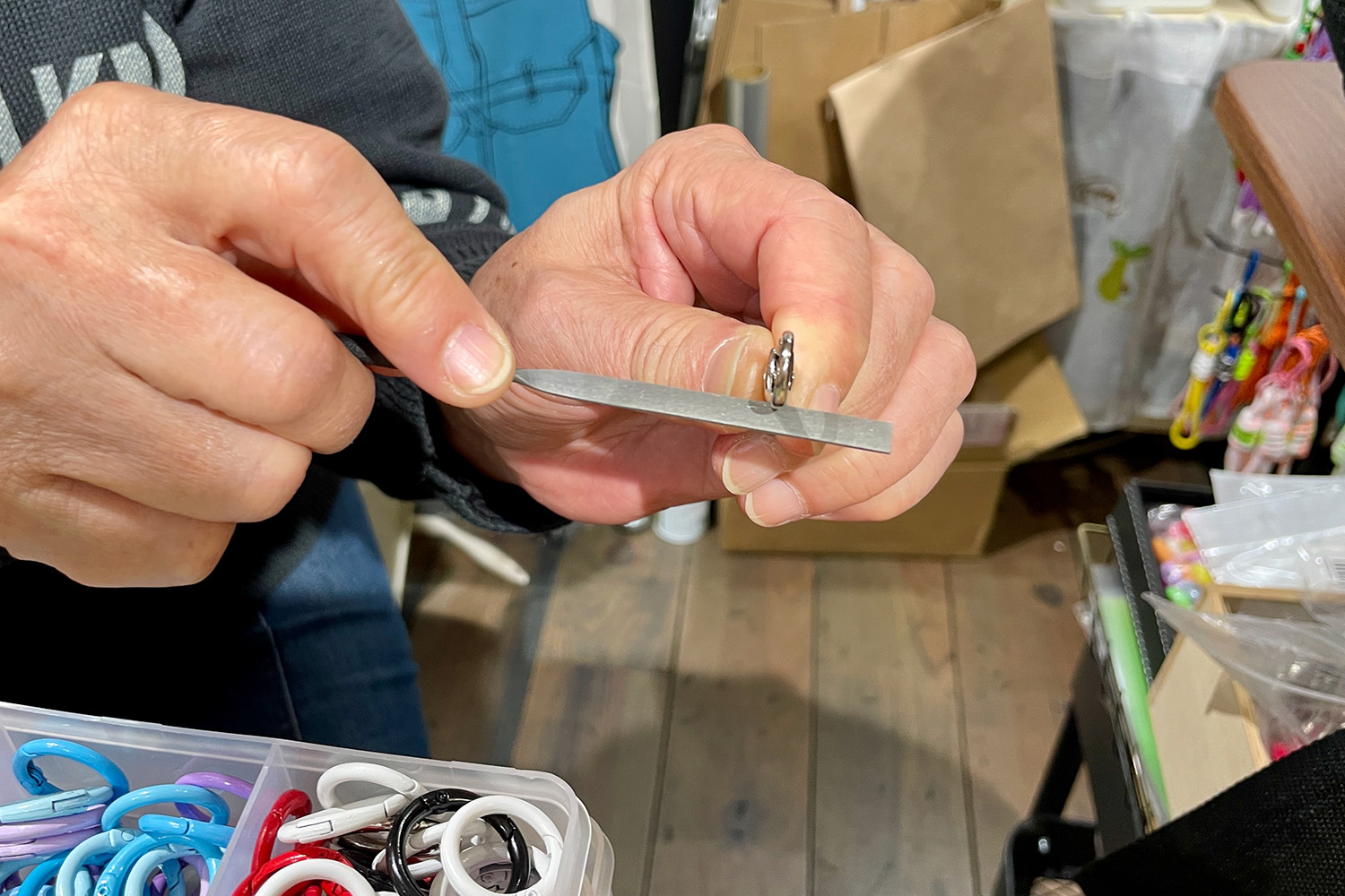 キーホルダーの金具の扱いやすさも重要。扱いが楽な「レバー鐶(かん)」を採用していますが、母・敬子さんが一つ一つ、きちんと開閉するか検品しています。