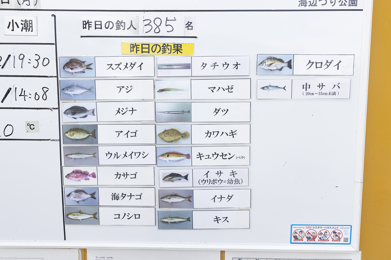 —— 施設の入り口に、昨日の釣果が載ってますね。