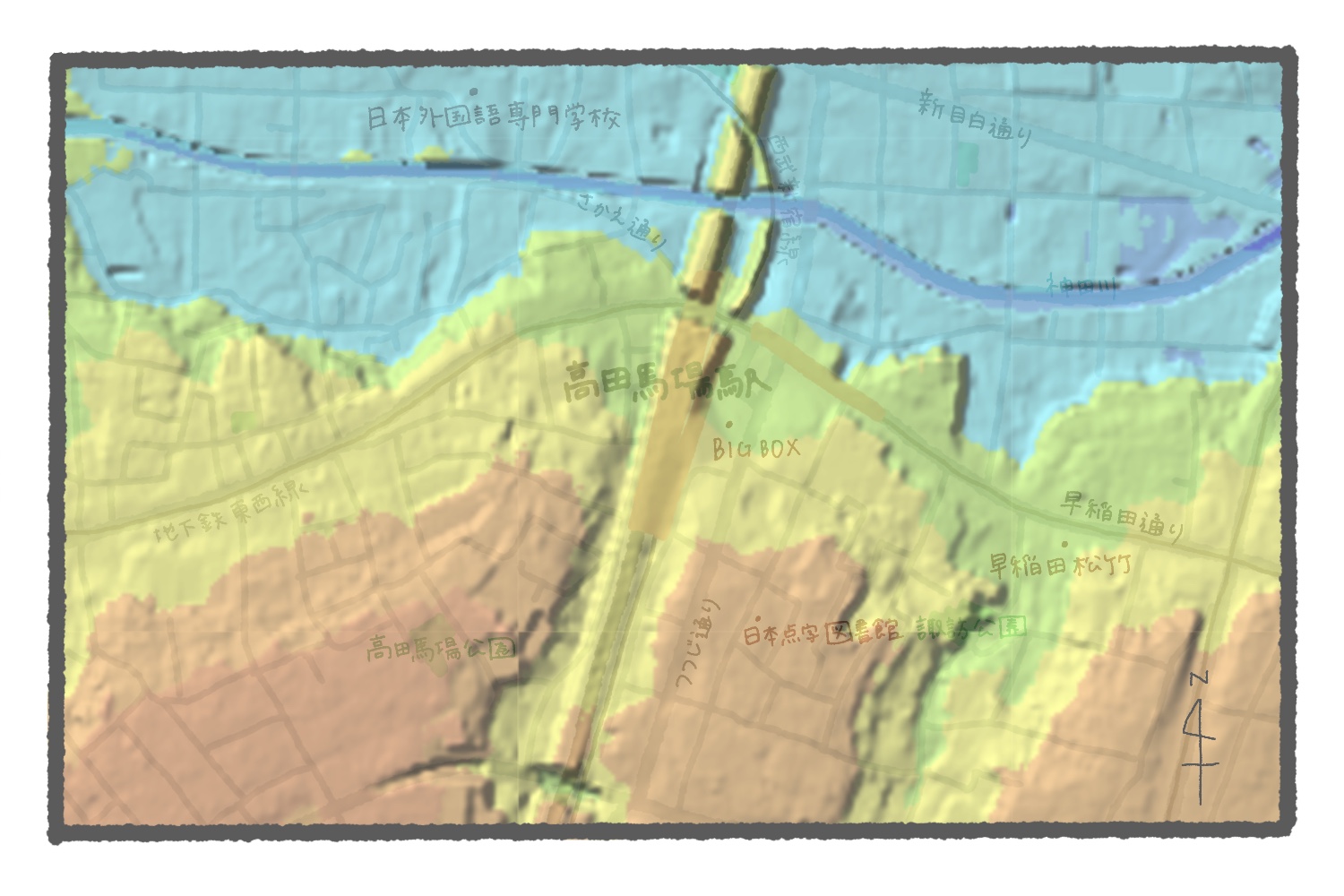 地図模様にわかりやすく表れているところは少ないが、地形の起伏もおもしろいエリアだ。神田川がつくる谷があり、その南側に豊島台、(地図の範囲外になるが)北側に目白台。山手線の線路はこの谷を越えるため、盛り土してつくった築堤の上に線路を通した形になっている。