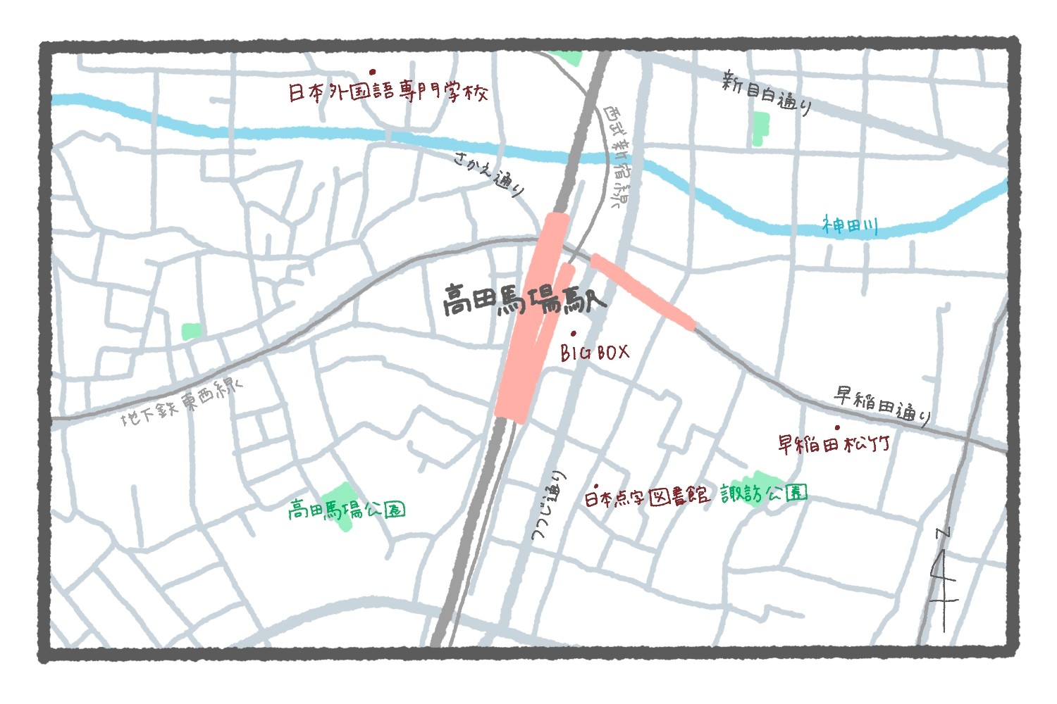 また、駅北西にあるカーブを描いた道が印象的だが、これが実はかなり古くからある道筋。周囲が田んぼや畑だらけのなかで、現在の早稲田通りとさかえ通りがあり、駅のあたりが追分になっていたのだ。
