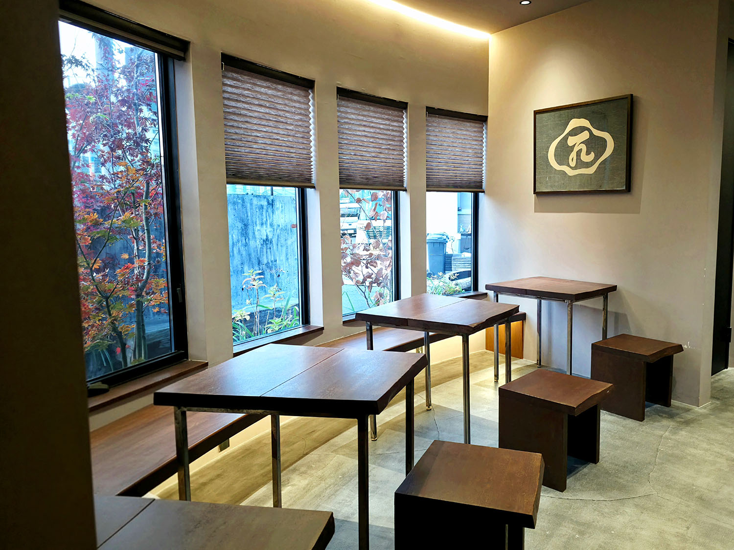 窓からは、お店のアプローチに植えられた木や緑を眺められて、四季の景色も楽しめるにゃー♪