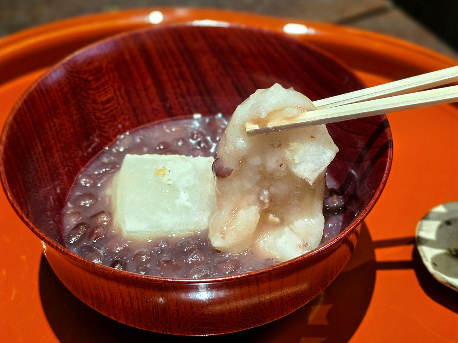 一般的には、田舎汁粉が素朴な味わいで、小豆を濾(こ)した御膳汁粉が上品な味わいとされますが、この田舎汁粉は小豆の粒をしっかり感じられるのに上品で、さすがのおいしさ。