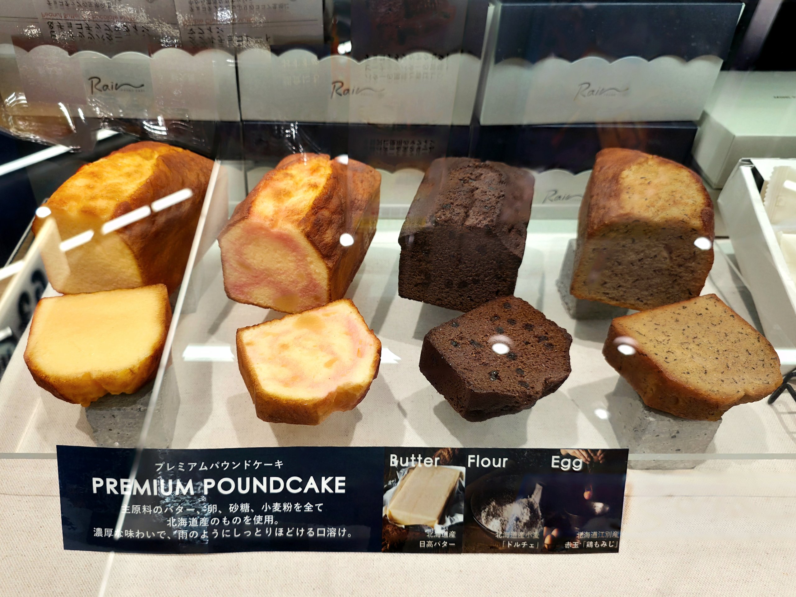 看板商品のプレミアムパウンドケーキは、北海道の素材にこだわり小麦粉は北海道産「きたほなみ」、砂糖は北海道産てん菜100%の「ビートグラニュー糖」、バターは日高地方の乳牛の生乳から作られたもの、卵は北海道の広大な自然で育んだ鶏の最高級品質のものを使っています。