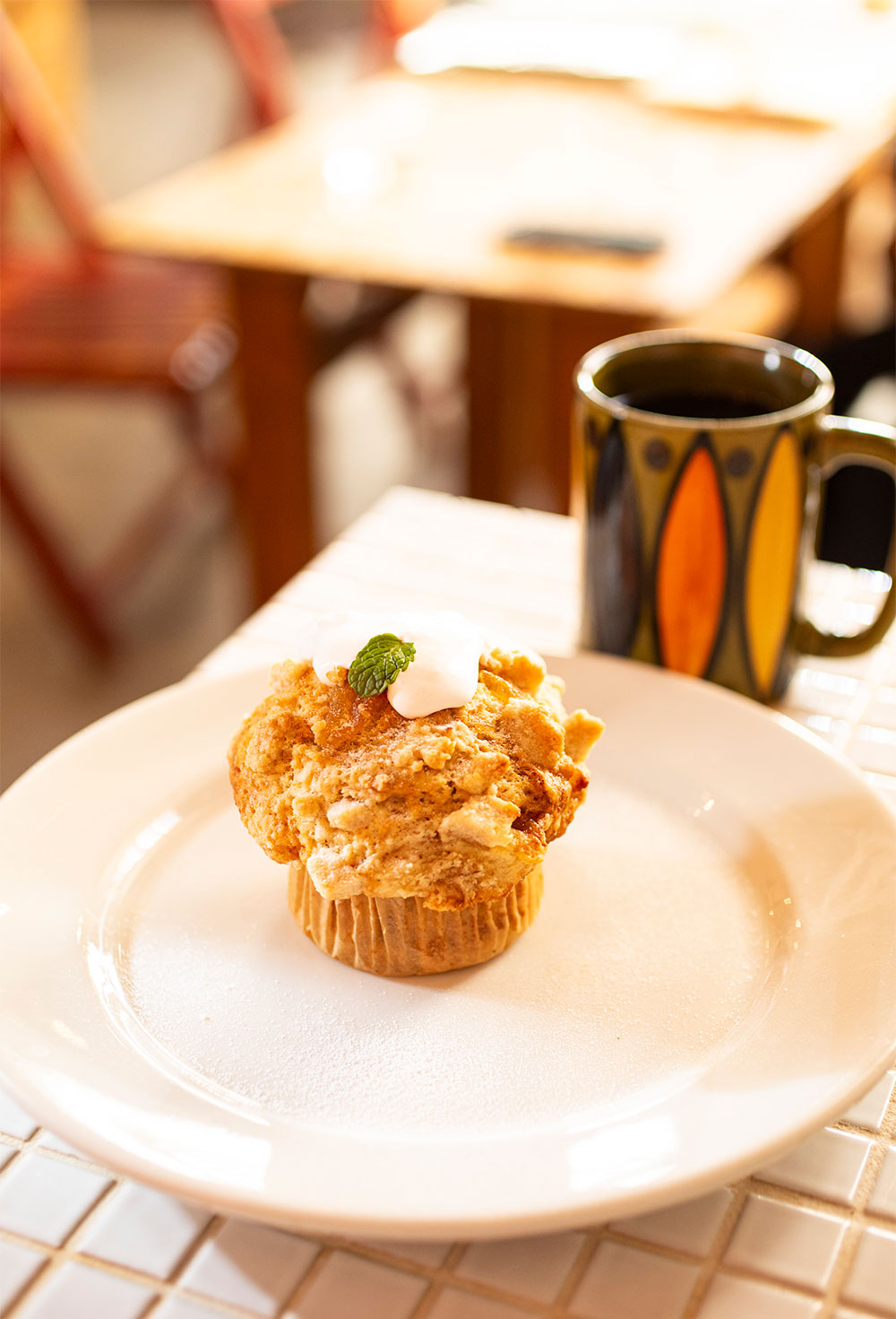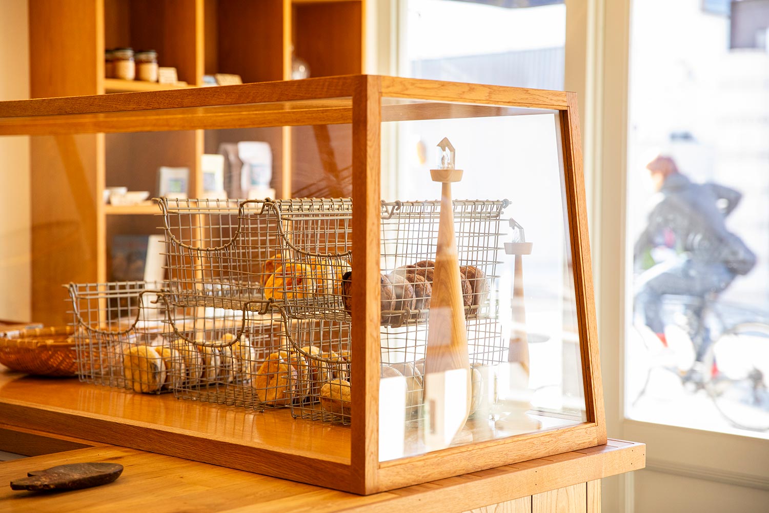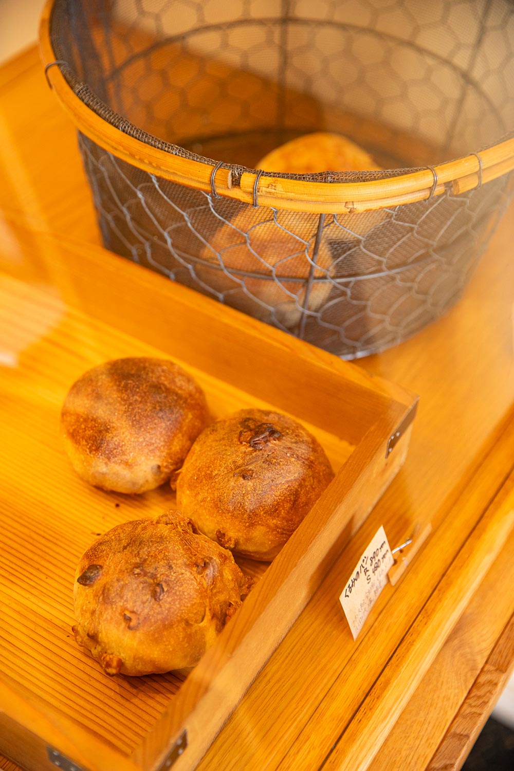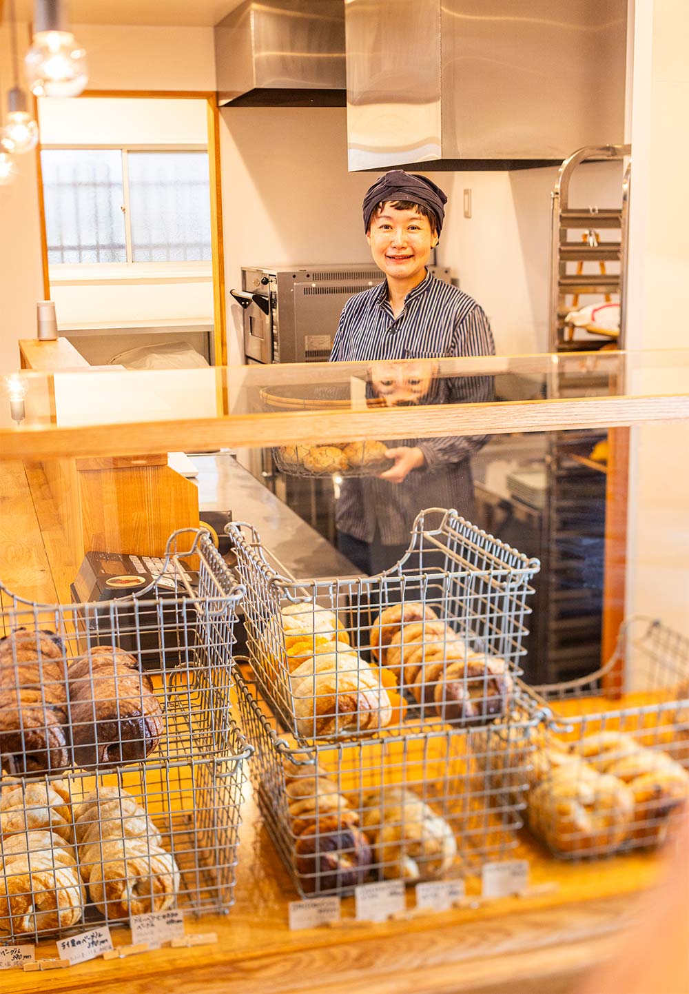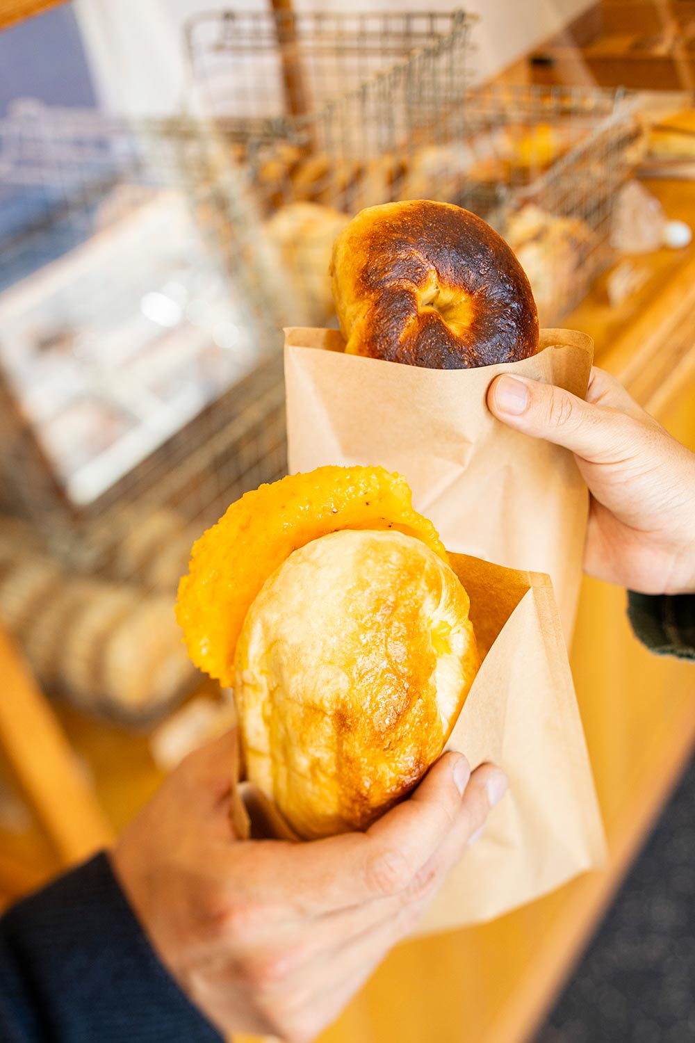 街道沿いでふと出合う、吊るされたベーグルの模型が目印だ。扉を開いて店内へ入れば、小麦の香りがふわり。「古代小麦のスペルト小麦を使ってるんです」とは、店主の羽鳥杏子(きょうこ)さん。ショーケースにはプレーン、チェダーとペッパー、チョコとクルミなど、多彩なベーグルがズラリ。今日は自家製味噌のやつをいただこう。頬張った瞬間、もっちり食感に思わずにっこり。口中広がる小麦と味噌の香ばしさで、心が和む。