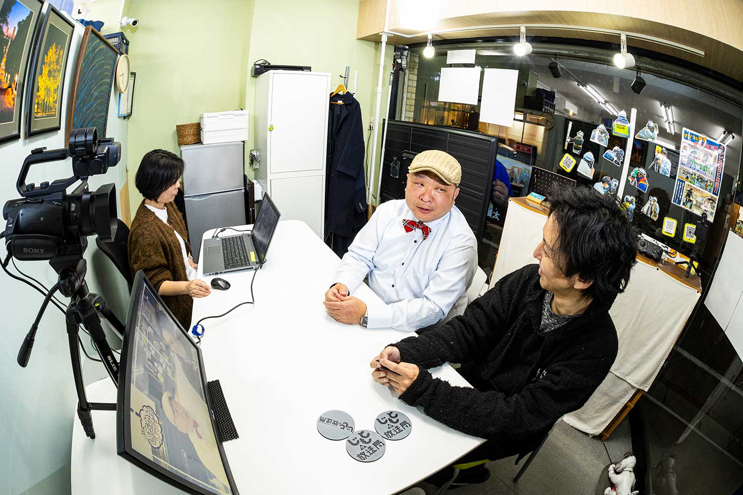 通りをぶらついていると、なにやらラジオ局のような一角が。ここ、測量の会社だが、社員教育用のYouTube動画が注目されヒット。以来、地域のオモロイ人や魅力的な店を取り上げる放送局を始めてしまったのだ。現在はスタジオでライブ配信も行っていて「宣伝したいことある人、誰でもおいで」と、代表兼局長の野村英樹さん。このゆるい雰囲気なら、緊張せずにしゃべれちゃいそう。