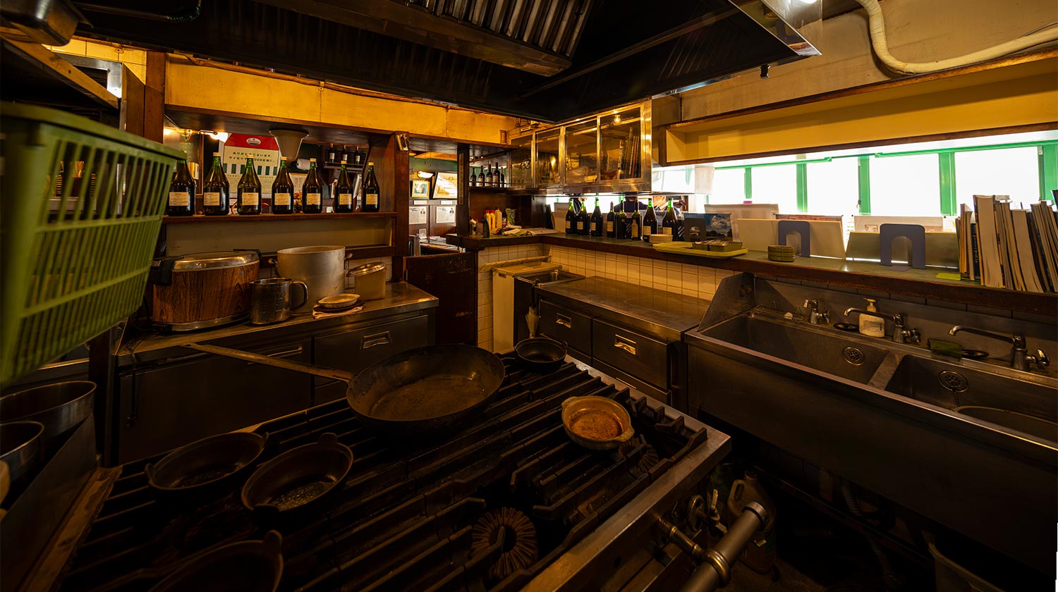 閉店当時の姿で残された館内を見渡すと、計算され尽くした店づくりがうかがえる。動線を意識した厨房(ちゅうぼう)のつくり。自社栽培のブドウやワインの秘密。社員や役員のアツい言葉。値上がり著しい現代で客が安く、たらふく食べられる理由に納得。現在の実店舗ではアピールしてないのもかっこいい。