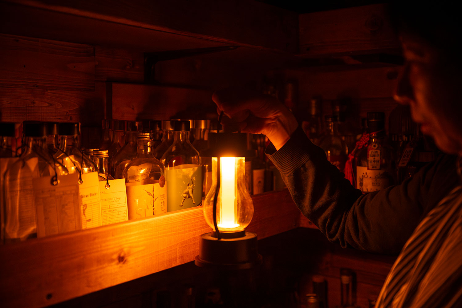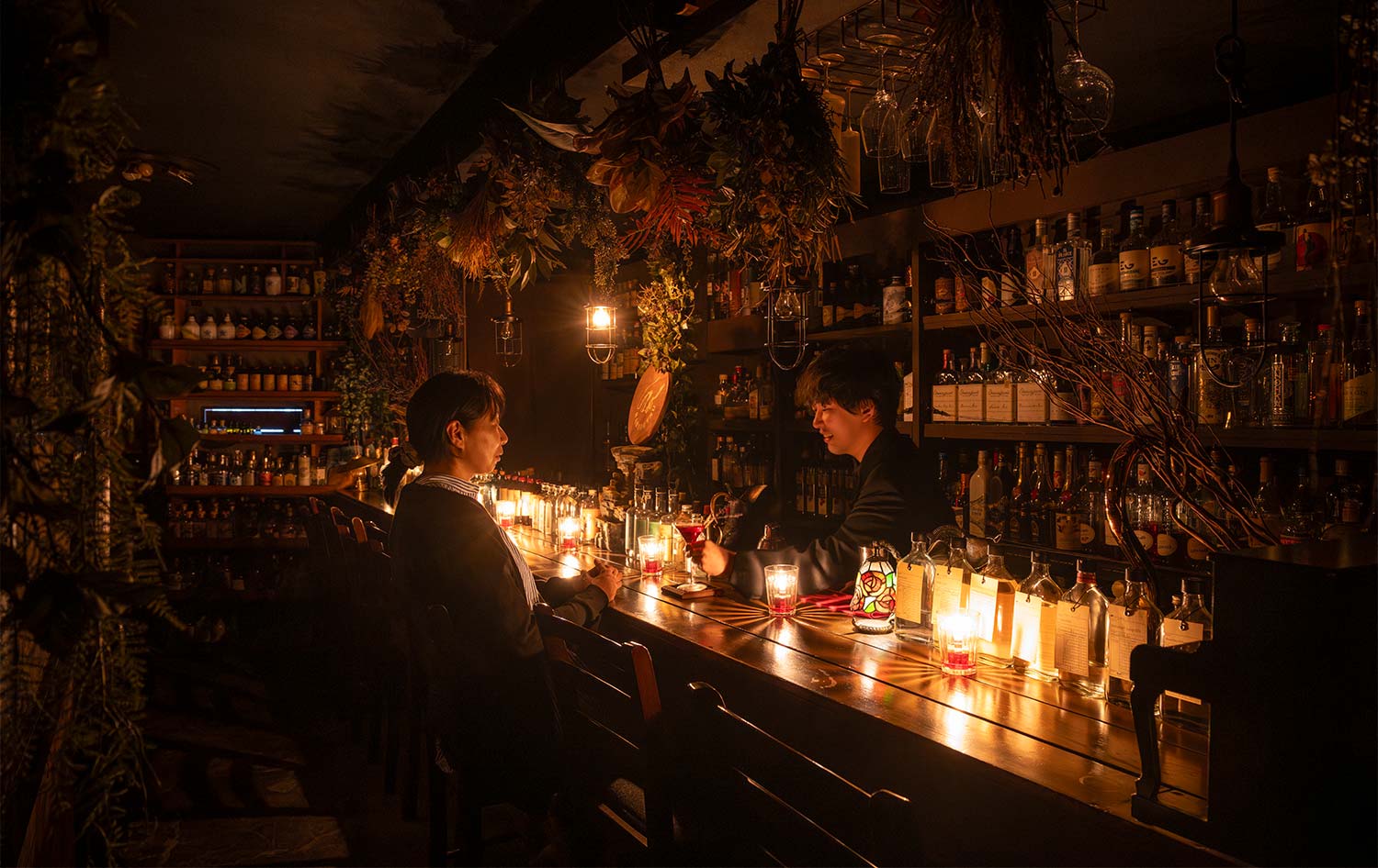 “飲む香水”と言われるジンに魅せられた小野寺総章さんが営むジン専門店。壁に設えた棚いっぱいに並ぶ国内外のジンは1000本以上!「 ジンはカクテルに多用される拡張性の高さと、草根木皮を使ったその土地の個性が出るのが魅力です」。ロウソクの明かりだけの暗い店内は視覚情報を遮断し何にもとらわれず過ごせるようにとの思いから。静かな心でジンと向き合えそう。