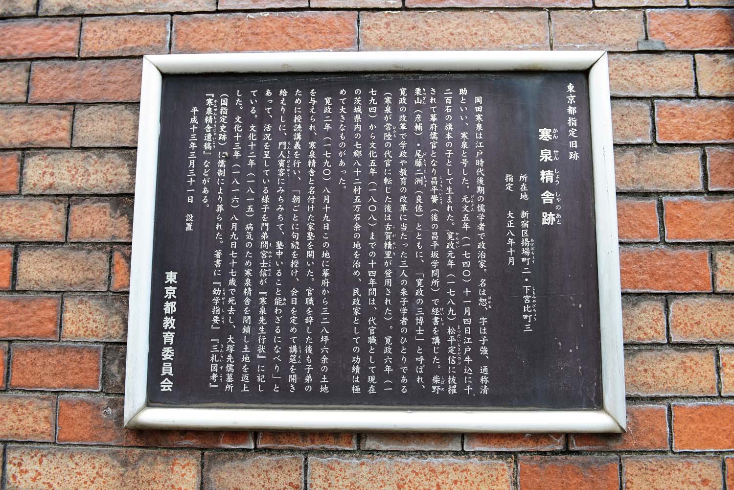 ビルの壁に掲示する偉人の説明板「寒泉精舎跡」