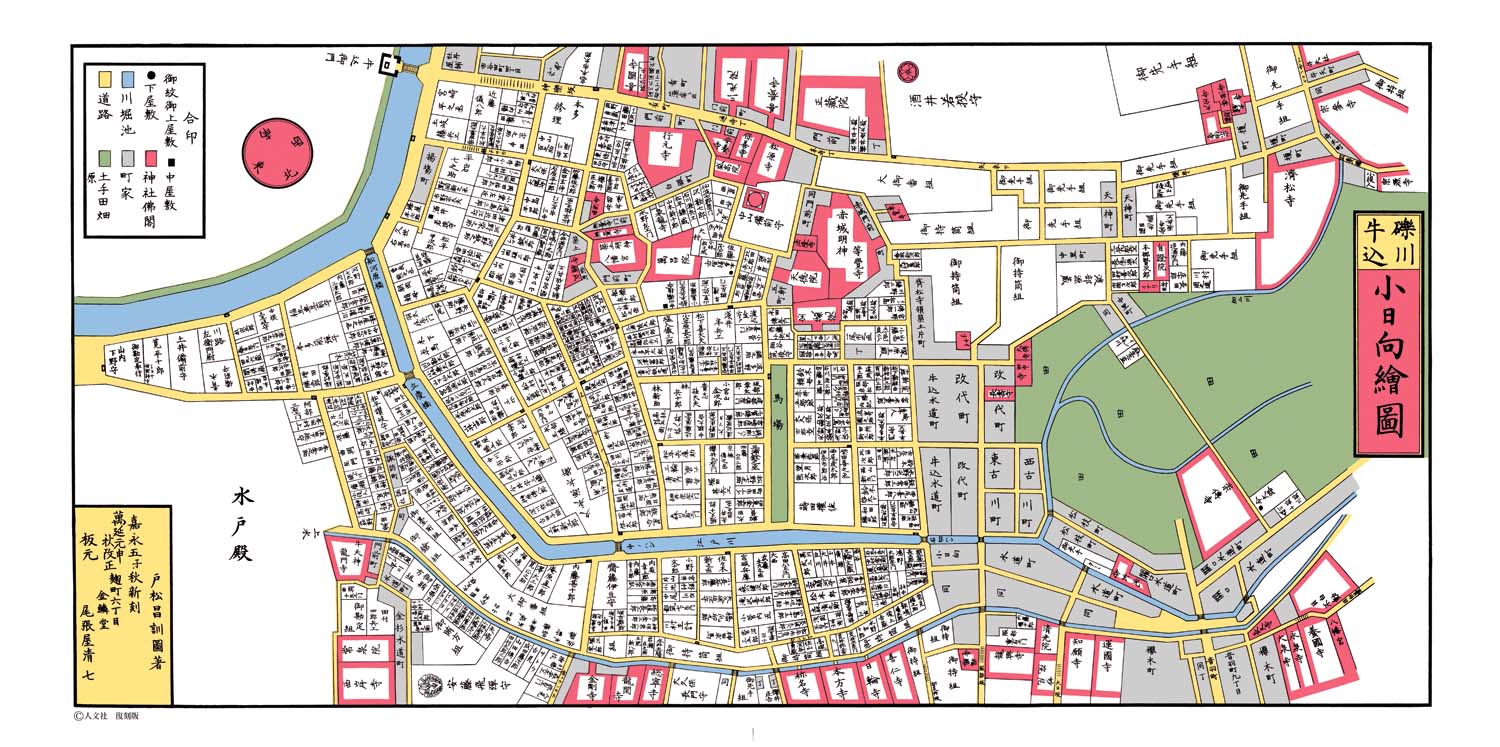「水戸殿」は水戸徳川家の上屋敷。徳川御三家に数えられる家柄なので地図にも「殿」が付く。現在は小石川後楽園として公開され、往時の姿をとどめる園内の散策が楽しめる。すぐ脇には「牛天神」と書かれた北野神社があり、当時から天神様として親しまれていたことがうかがえる。