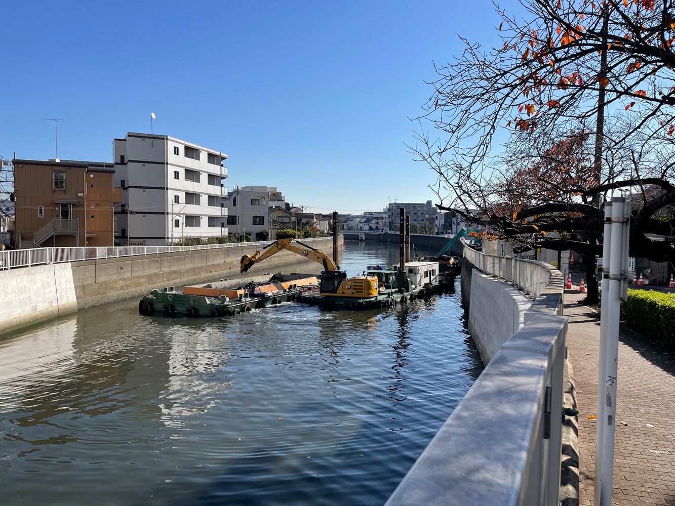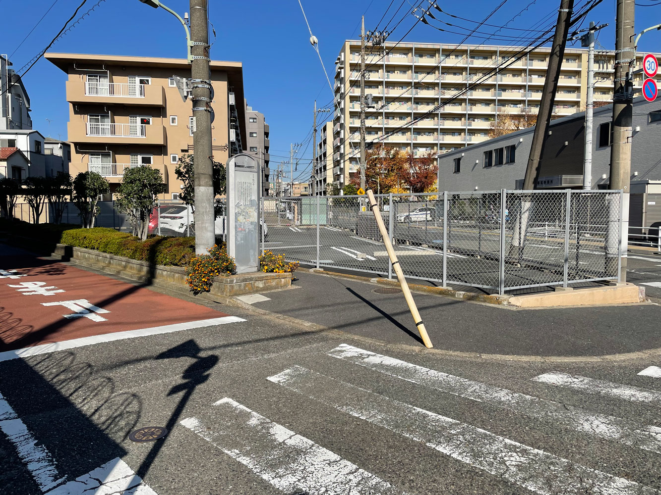 夫婦橋親水公園のある場所に着くと、何やら工事用の仮囲いが設置されていた。呑川の防潮堤耐震補強工事のため親水公園が資材置き場となっているらしく、入ることができないようだ。残念だが夫婦橋の親柱を見るのは諦めて、呑川の上流の方へ移動することにした。