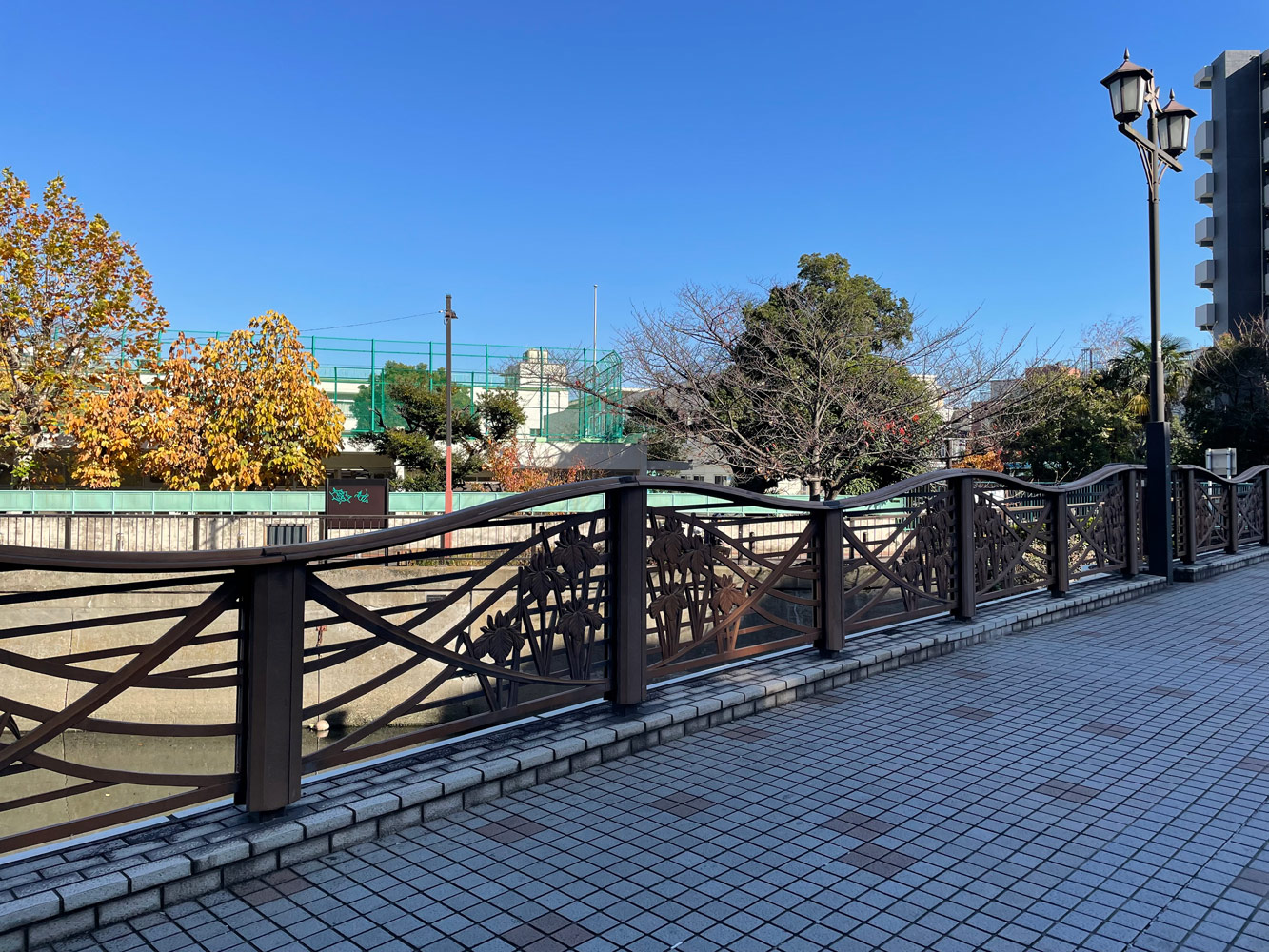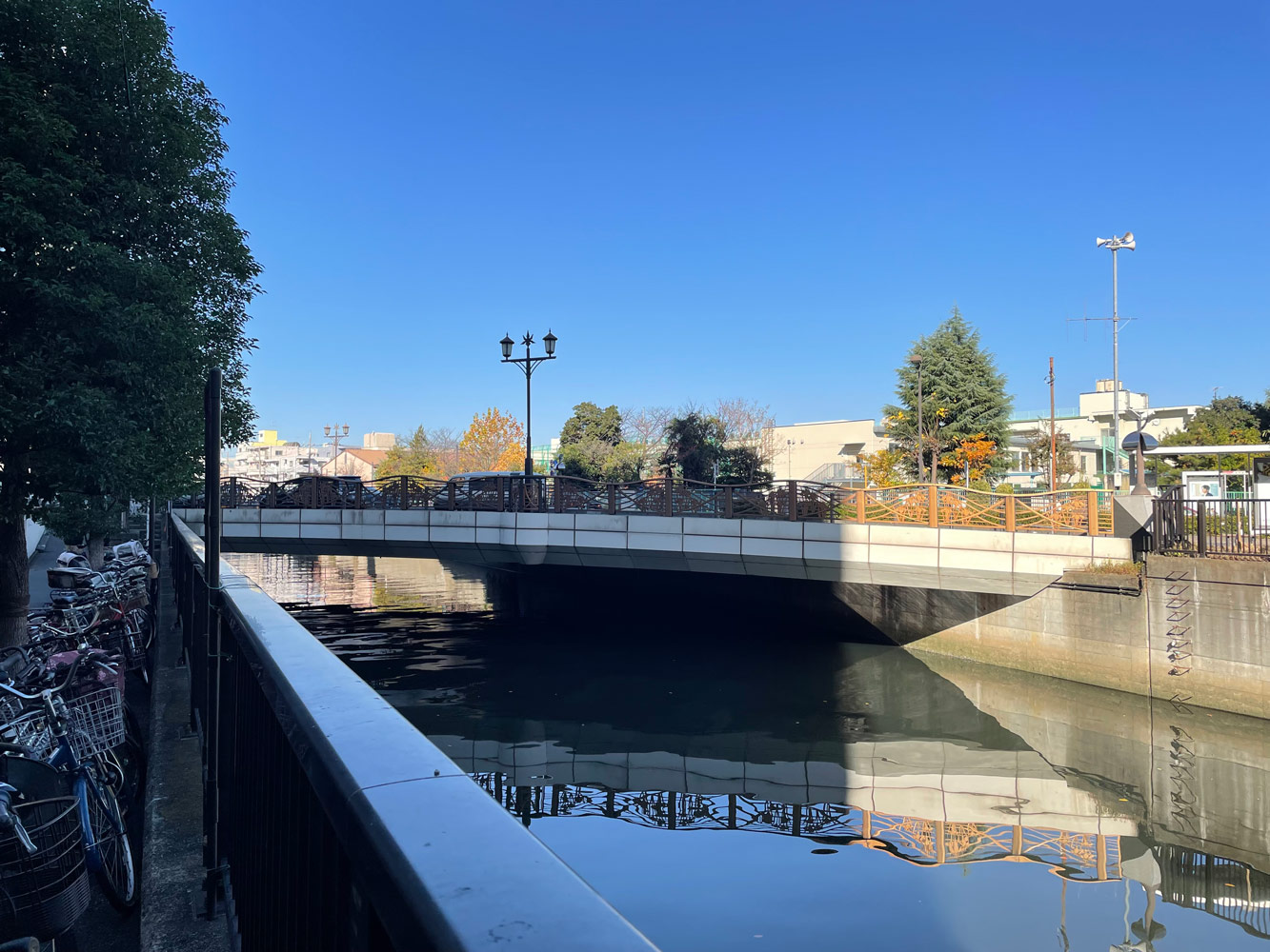 「あすと」を途中で右に曲がると、正面に呑川が見える。呑川に沿って西に進み、東邦医大通りを渡り、再び歩くと右手に見えてくるのが菖蒲(あやめ)橋だ。
