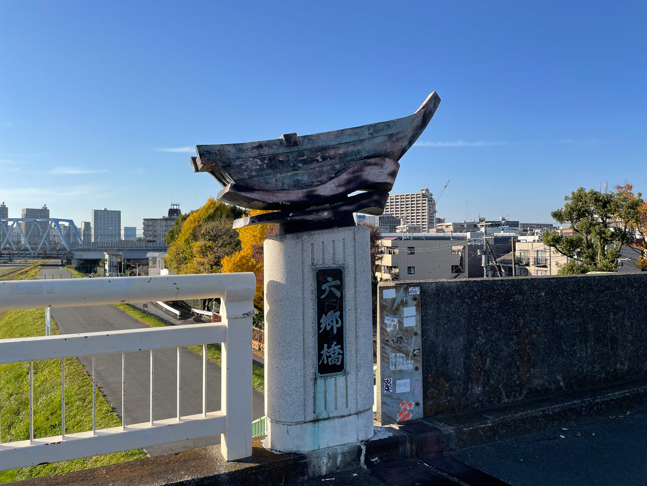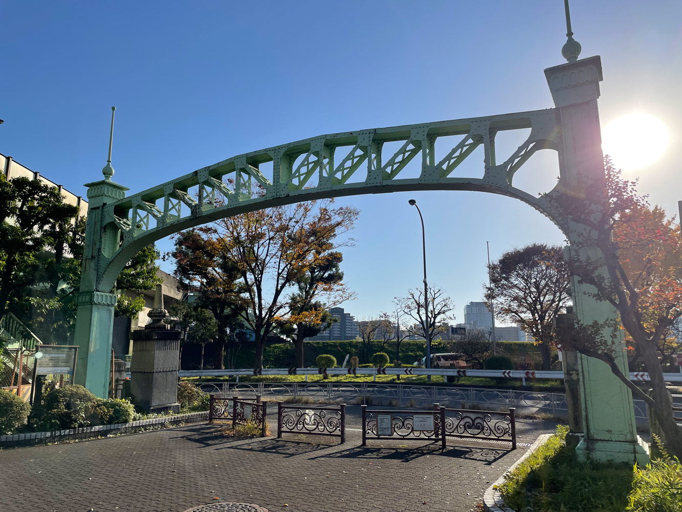 ロータリーに囲まれた目立たない場所にある公園だが、およそ100年前に架けられた旧六郷橋のアーチが役割を終えた今もこうして多摩川を見つめている様子にはグッとくるものがある。ちなみにもう一対の親柱は橋を渡った川崎市川崎区宮本町の稲毛公園に保存されているそう。