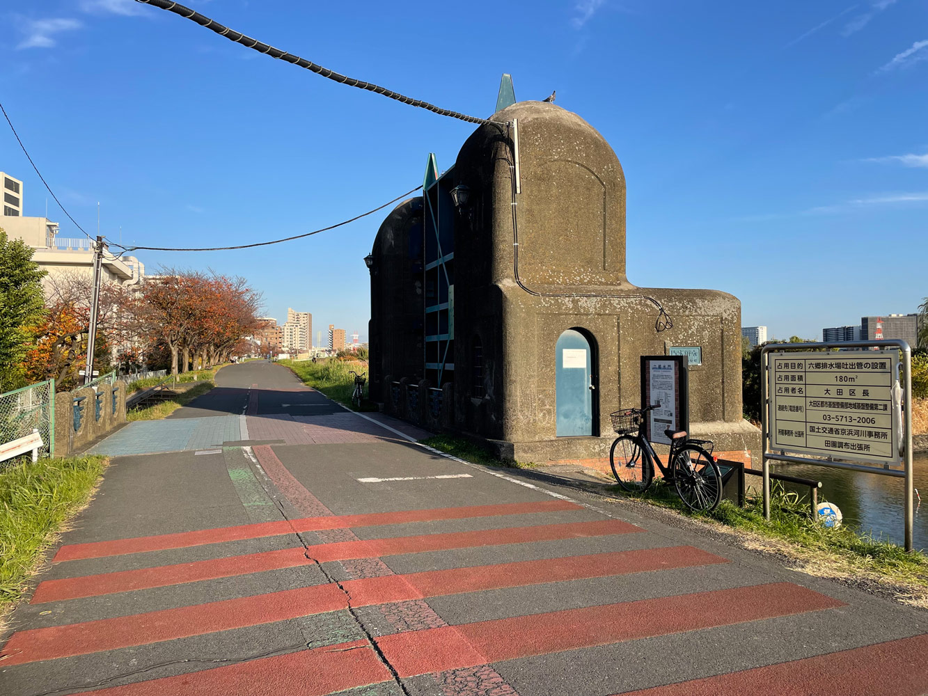 またしばらく進むと土手の道の右手に変わった形の構造物が現れる。六郷水門だ。