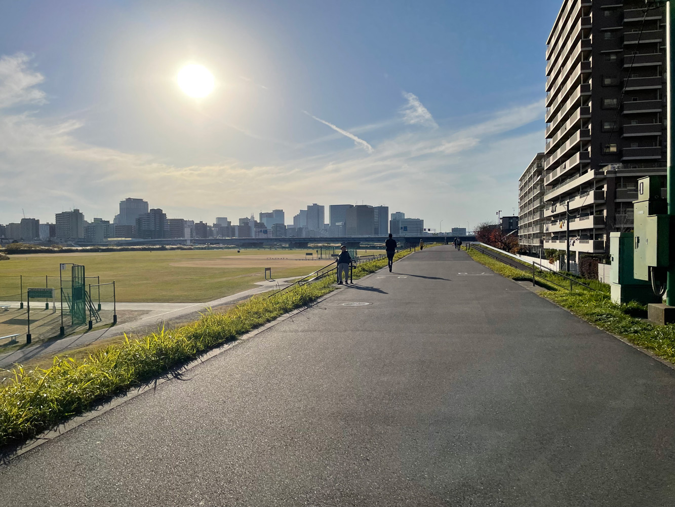 大阪の淀川河川敷のすぐそばに梅田の高層ビル群が立ち並ぶ風景も好きで、河川敷とビル群という組み合わせには、なぜかわくわくしてしまう。