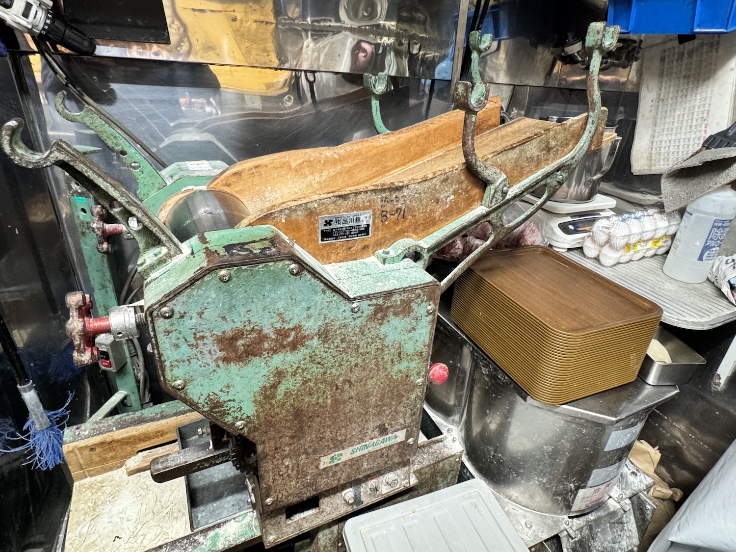 とりあえずツユ作りの基本は覚えたので、次はそば。当時、立ち食いそばはゆで麺使用の店が多かったが、前田さんは生麺にこだわった。前田さんはサラリーマン時代に、生麺使用で人気だったチェーンの『小諸そば』によく通っていて、あのそばに近づけたいと考えたのだ。しかし『小諸そば』のような白く細い生麺は当時、調達するのが難しく、それならと自分で製麺しようと考えた。とはいえ、そば作りはやったことがない。そば粉の業者、製麺機メーカーに教えてもらい、試行錯誤の末、ようやく自分好みのそばを製麺できるようになったという。