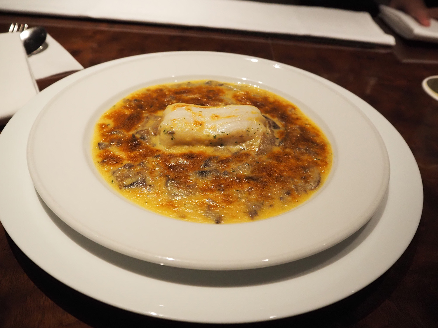 間根山さんのお話とともに、「舌平目の洋酒蒸 ボンファム」もおつまみとしていただく。大正11年(1922)、開業から2週間後に行われた結婚披露宴のメニューにもすでに記載がある、これも東京會舘の名物である。舌平目とシャンピニオンを白ワインと魚の出汁で煮込んだ一品だが、バターがたっぷり使われていて、食べ応え十分(つまみとしては、自分にはあまりにも豪華だが!)。