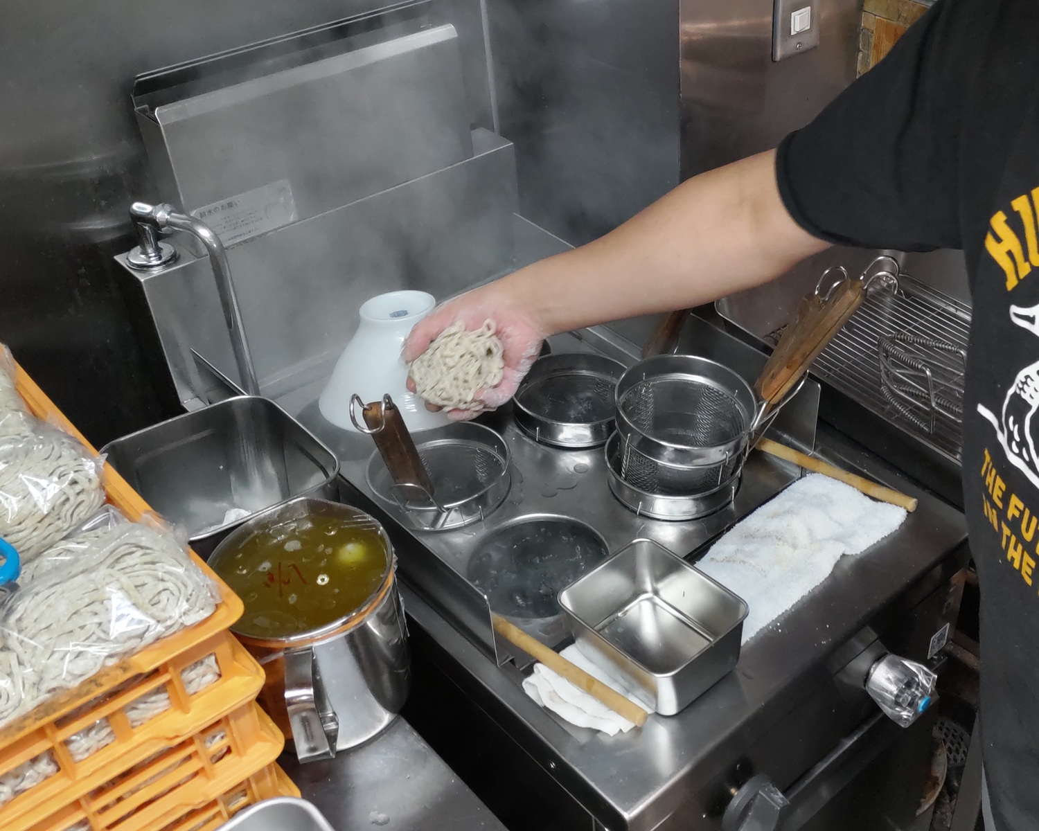 初来店の人には、特製手揉み中華そば(醤油)1550円と、炭火つるし焼豚丼500円がおすすめだという。それらを注文すると、髙野さんはスープを沸かしつつ麺を揉む作業に取り掛かる。