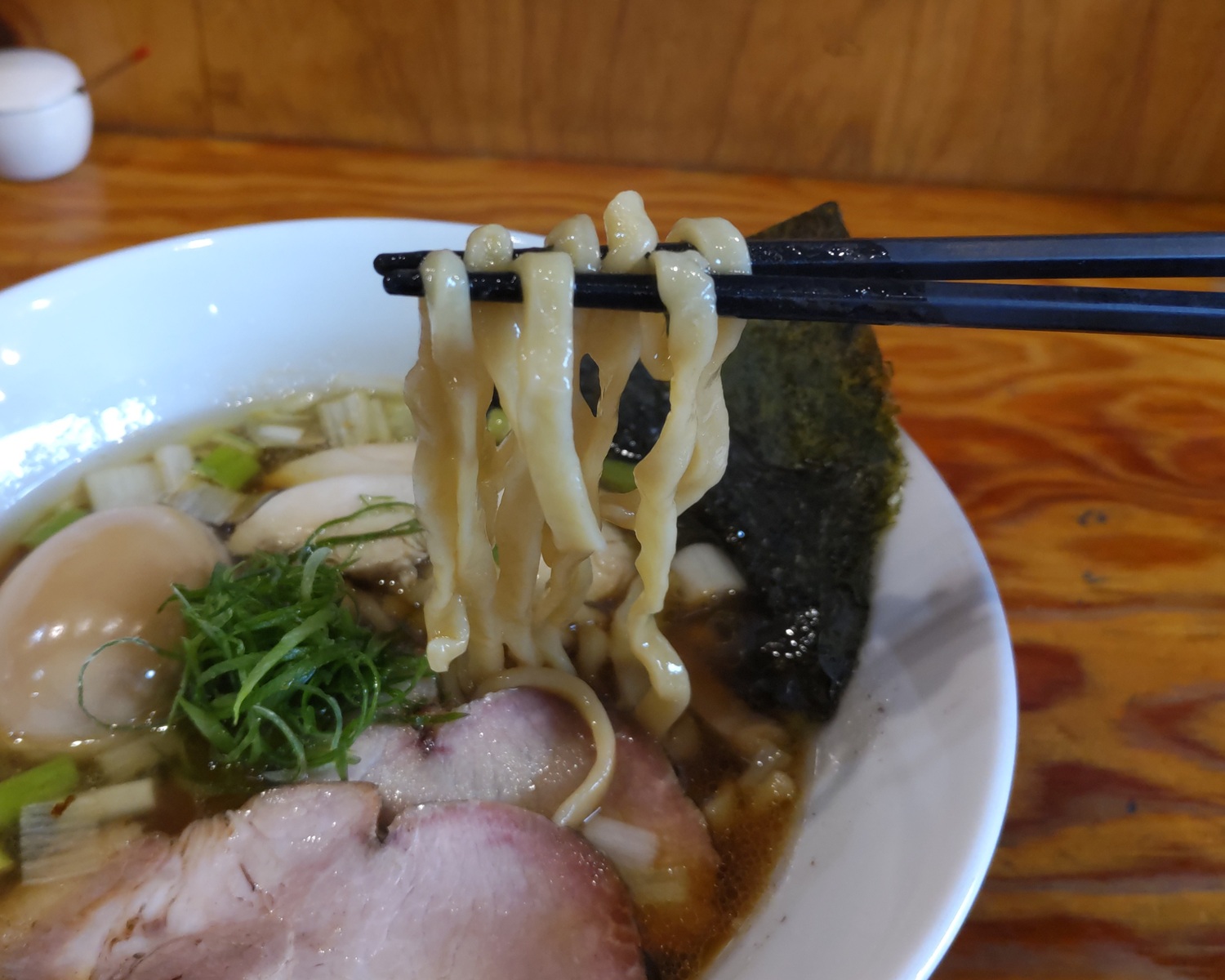 太めの縮れ麺はモッチリしていて適度なコシもある。口の中にほんのり広がる小麦の香りが、重層な醤油スープと絡み合い、絶妙な相乗効果を生む。