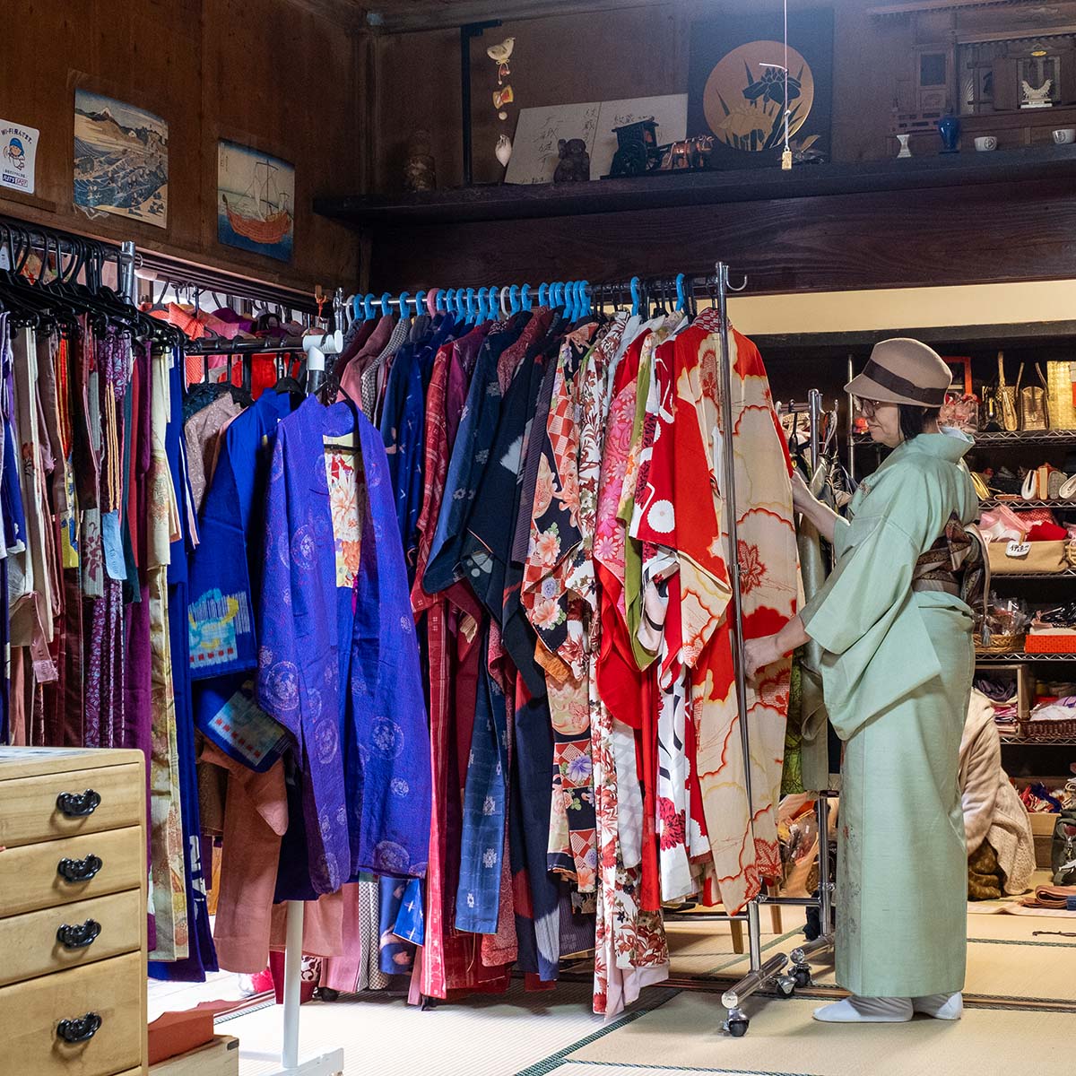 築約160年の古民家を活用し、NPO法人ふれあいサークルすずろが運営。各地から寄付された着物をリサイクルして販売(1000~5000円)するほか、レンタル着付け(2000円~、予約優先)にも対応。着物をリメイクしたワンピースやパンツなどもあり、洋服にない色合いや柄が新鮮。