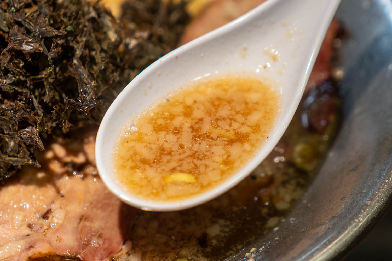 ゆでるのに5分30秒かかる太麺は、さすがの食べ応え。もちもちした食感も楽しい。豚もも肉のチャーシューは、窯焼きされていて、しっかりしたかみごたえと香ばしい風味が生きている。スープを吸った岩のりが麺に絡み、みじん切りの玉ねぎやほんのり香るゆずも相まって、最後まで飽きない。