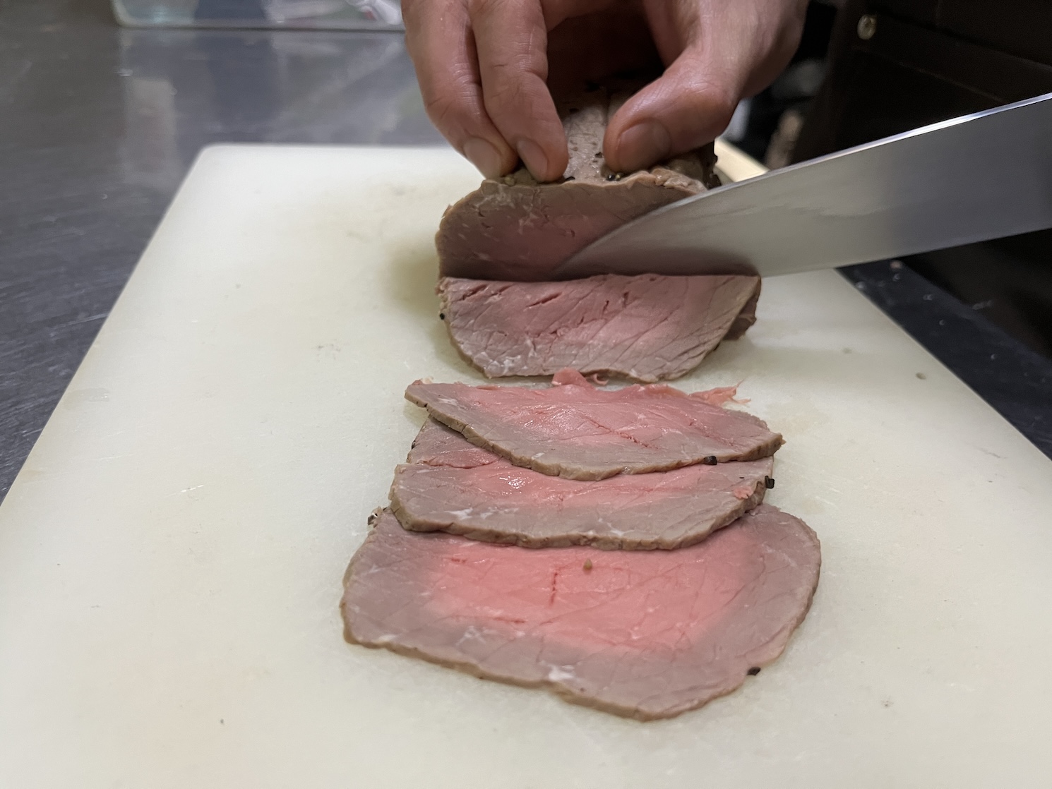 ローストビーフは国産牛を使用し、塩コショウなどで下味をつけてから軽く焼き、さらに調味料で漬け込む。仕上げから提供まで3日間かけ丁寧に作っている。