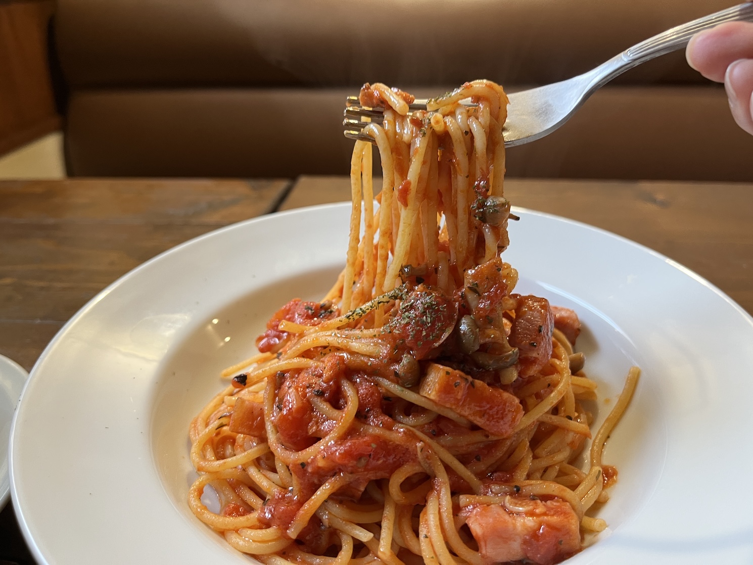 トマト、ベーコン、しめじ、ニンニクの旨味が溶け込んだソースがパスタによく絡む。
