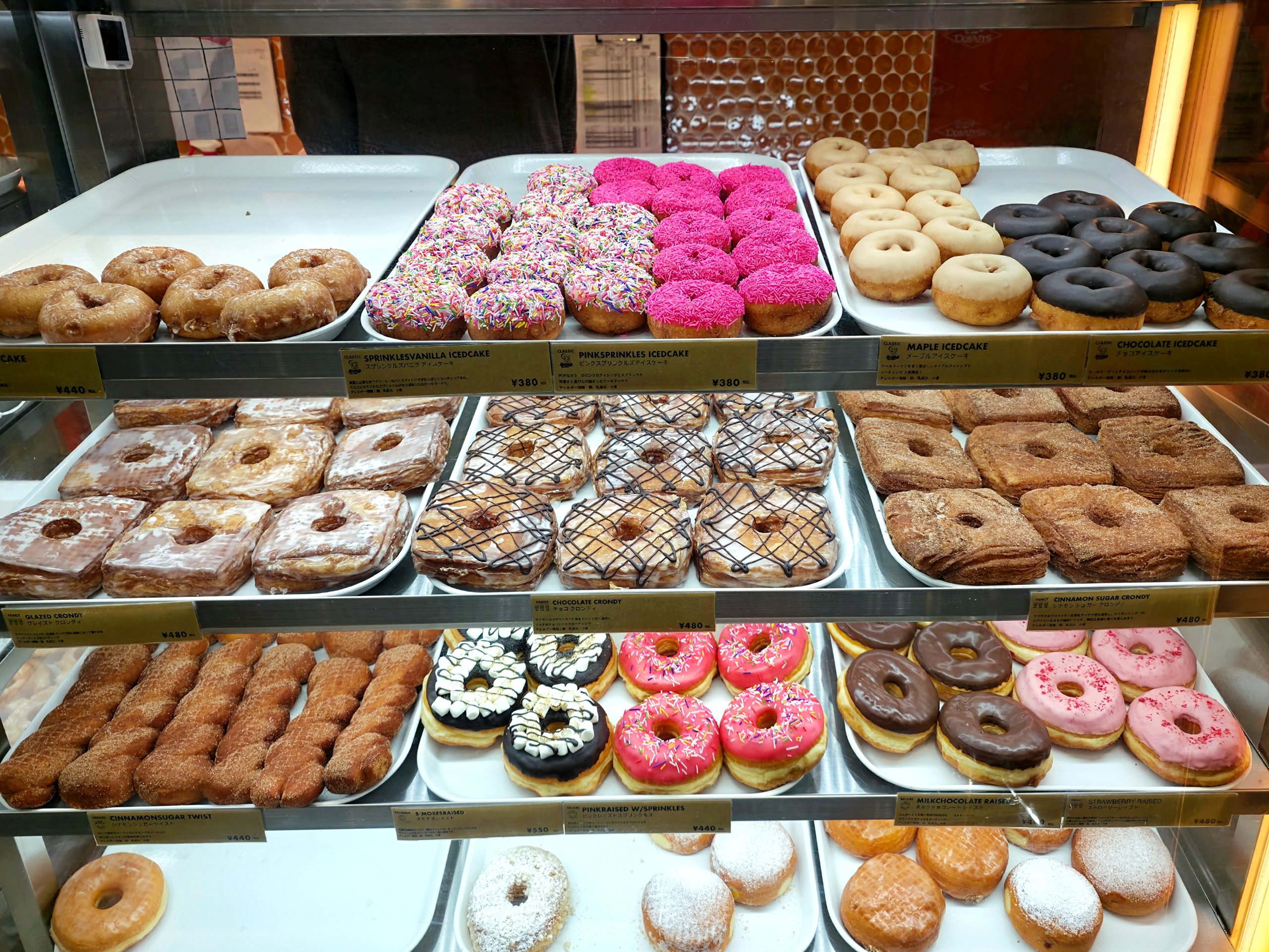 ショーケースに並ぶ大きくてカラフルなドーナツに黒猫テンションMAXひゃっほー!