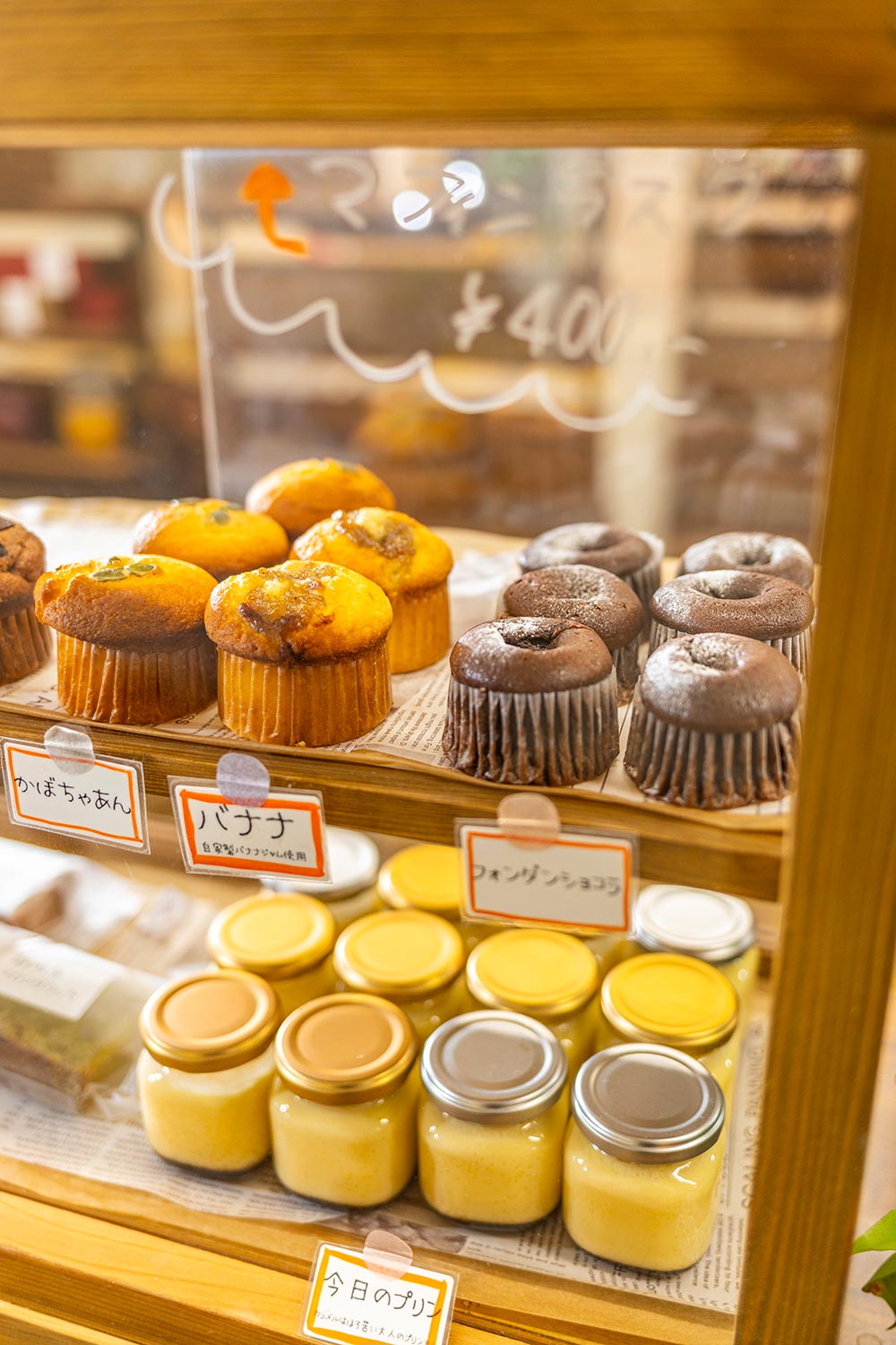 白のれんが印象的な懐石料理店『和馳走 藏屋』では、副料理長でパティシエの安本有希さんが作った焼菓子をおもたせ用に出したところ、評判に。そして2025年夏、専用工房で販売を開始した。名物はほろほろ生地にスパイスを混ぜたラムレーズンバターサンド。ホワイトチョコ&バターのクリームが濃厚だ。卵が濃いプリン、マフィン、フォンダンショコラもリッチ。