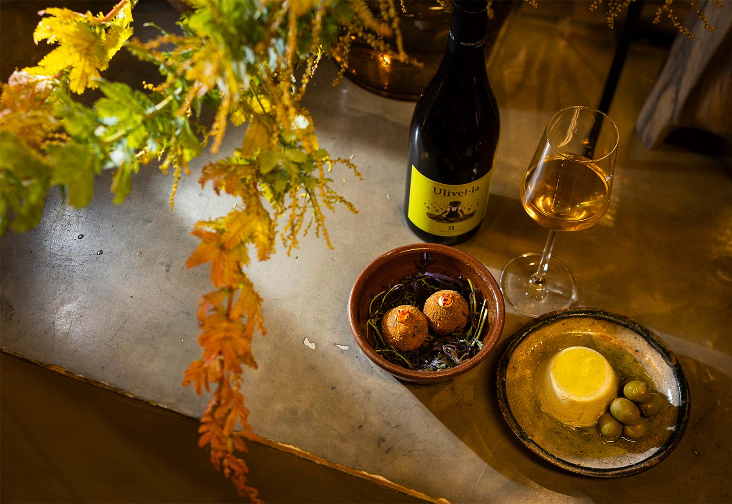 紫葉や銀葉のミモザ、観葉植物などが彩る洒落(しゃれ)た花屋ながら、中にカウンターバルが。「飲みながら花が選べる場所を」と、フローリストの上田絹子さんの夢を、料理人である夫の光嗣さんと実現。セラーにはスペイン産を中心に揃え、技ありタパスも充実。ショコラ&チュロスなど、スパニッシュスイーツもあり。