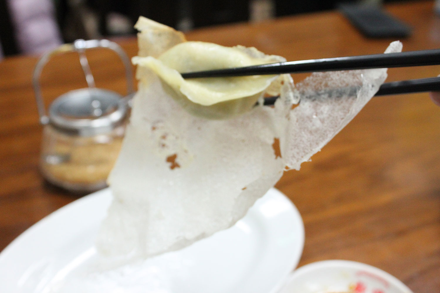 着席開口一番「羽根付き餃子(と紹興酒)ください!」と店員さんに告げ、ほとんど間もなくやってきたのが次の写真の羽根付き餃子である。