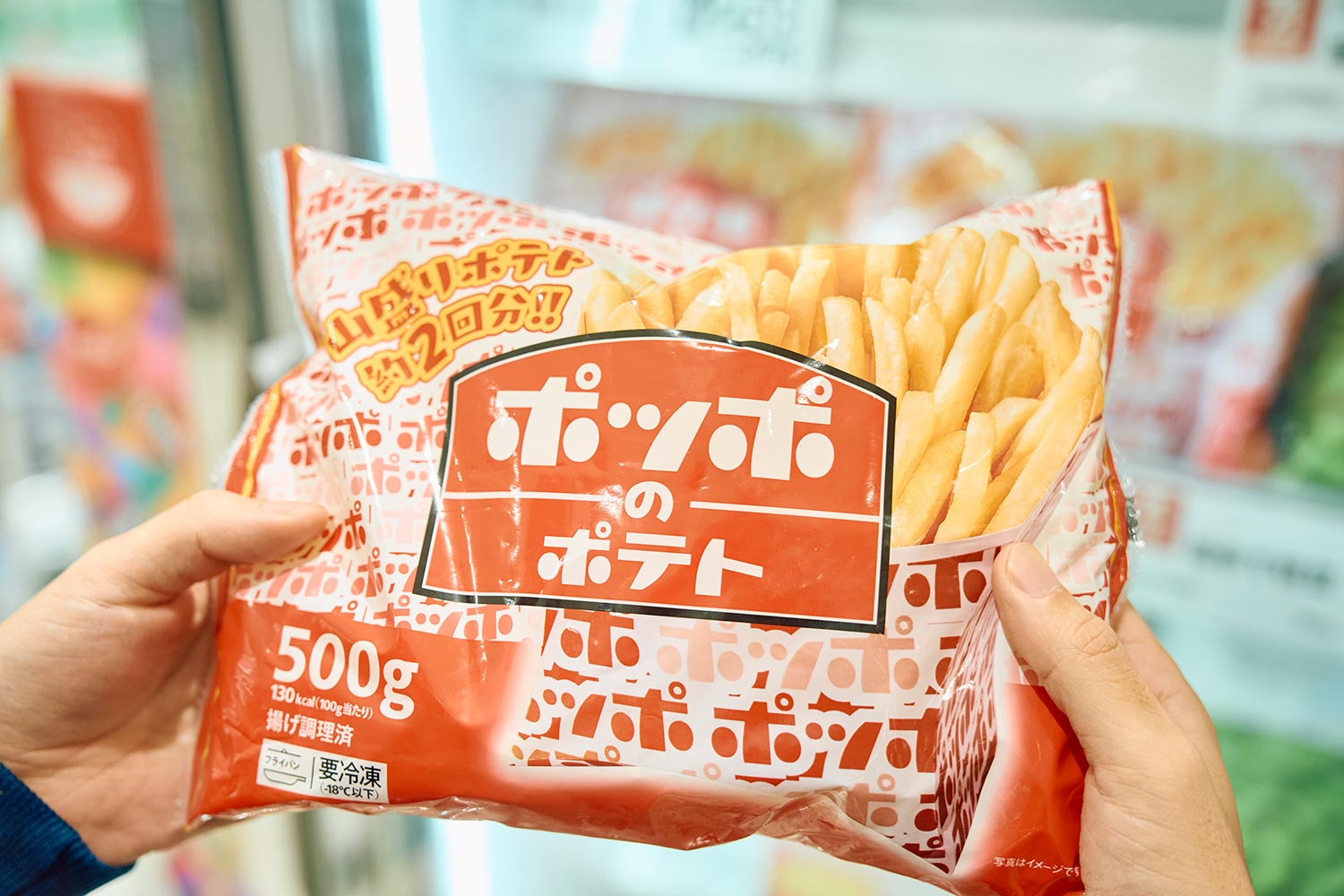 デイリー売り場(総菜コーナー)にはおなじみのボックスにギッシリ詰め込まれたポテトがズラリ。こんなん素通りできないよ……。冷凍はたっぷり500g。山盛りポテト2回分だぁ!