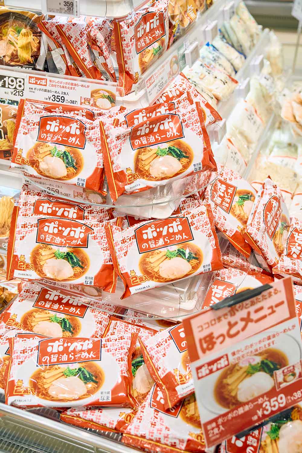 見よ、売り場を埋め尽くさんばかりの袋麺を。1袋2食分。鶏と豚をベースに魚介を加えたスープと細いちぢれ麺て、ポッポのラーメンそのものですやん……。困ります。もう、これ以外の袋麺を買えないじゃないですか!