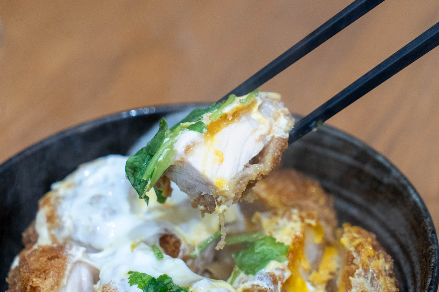 親子鍋で出汁と玉ねぎを火にかける。卵1個は、別の容器に割って溶いてあった。きつね色に揚がったとんかつはザクザクと包丁を入れて、火から下ろしていた親子鍋の中へ。再び鍋を火にかけて卵を回し入れて、三つ葉をのせる。ほどよく卵が固まると、どんぶりに入ったご飯の上にするりと盛り付ける。なんでもないように、調理が進んでいった。