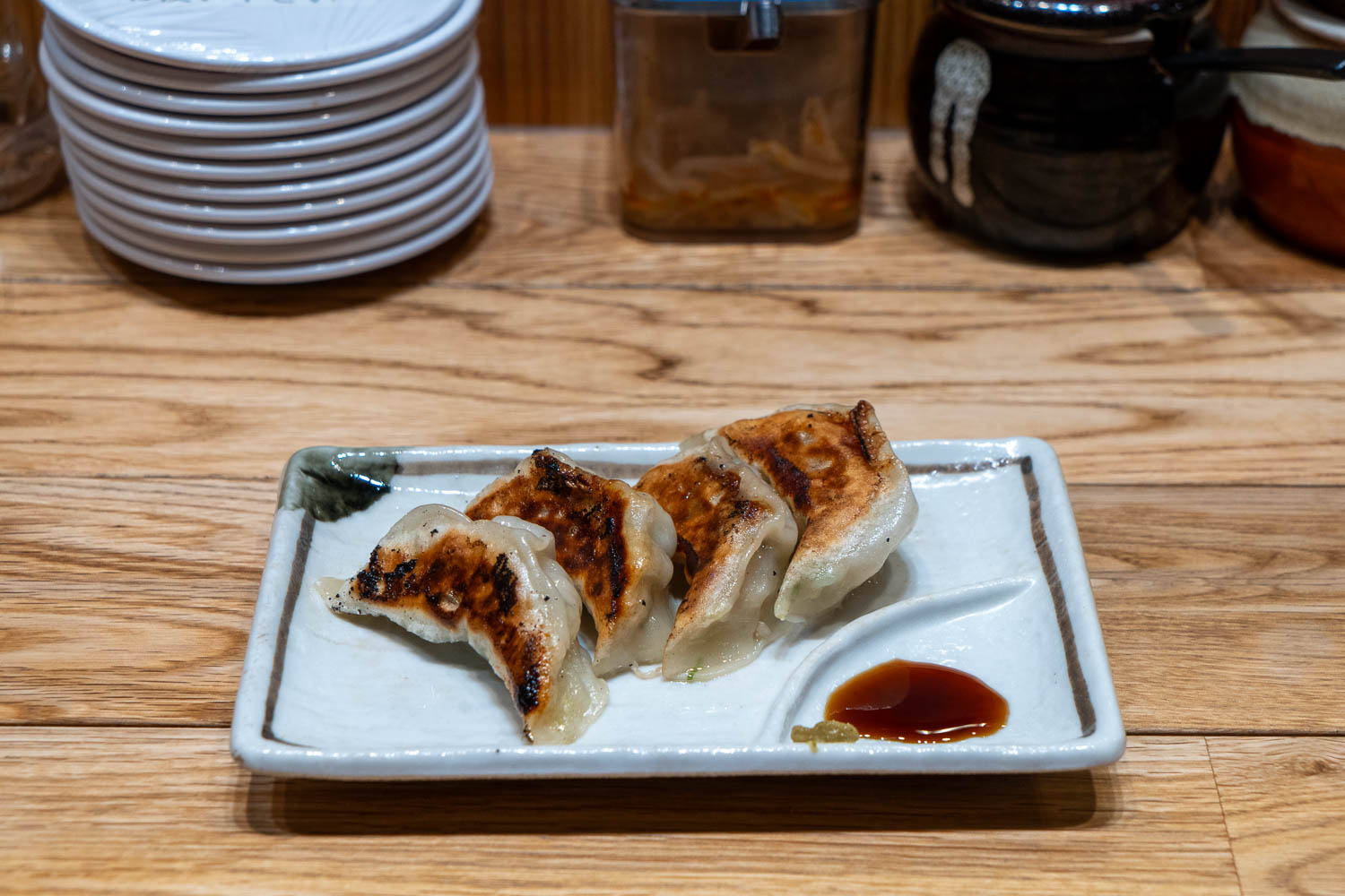 そして独立するにあたっては、3人の子供を持つ父としての視点から、家族連れが食事しやすいラーメン店でありたいと考えた。テーブル席を確保し、幅広い層に食事してもらいたいとランチタイムのセットメニューも充実させている。その中でも力を入れているのがサイドメニューの餃子だ。皮は麺と同じ製麺所から仕入れ、豚肉にキャベツ、玉ねぎ、白菜とニラを入れて店内で包んでいる。「その分、値段も安くできています」と八巻さん。肉と野菜のバランスがいい餃子には、醤油と酢も用意されているが、柚子胡椒を添えて食べるのがおすすめだ。