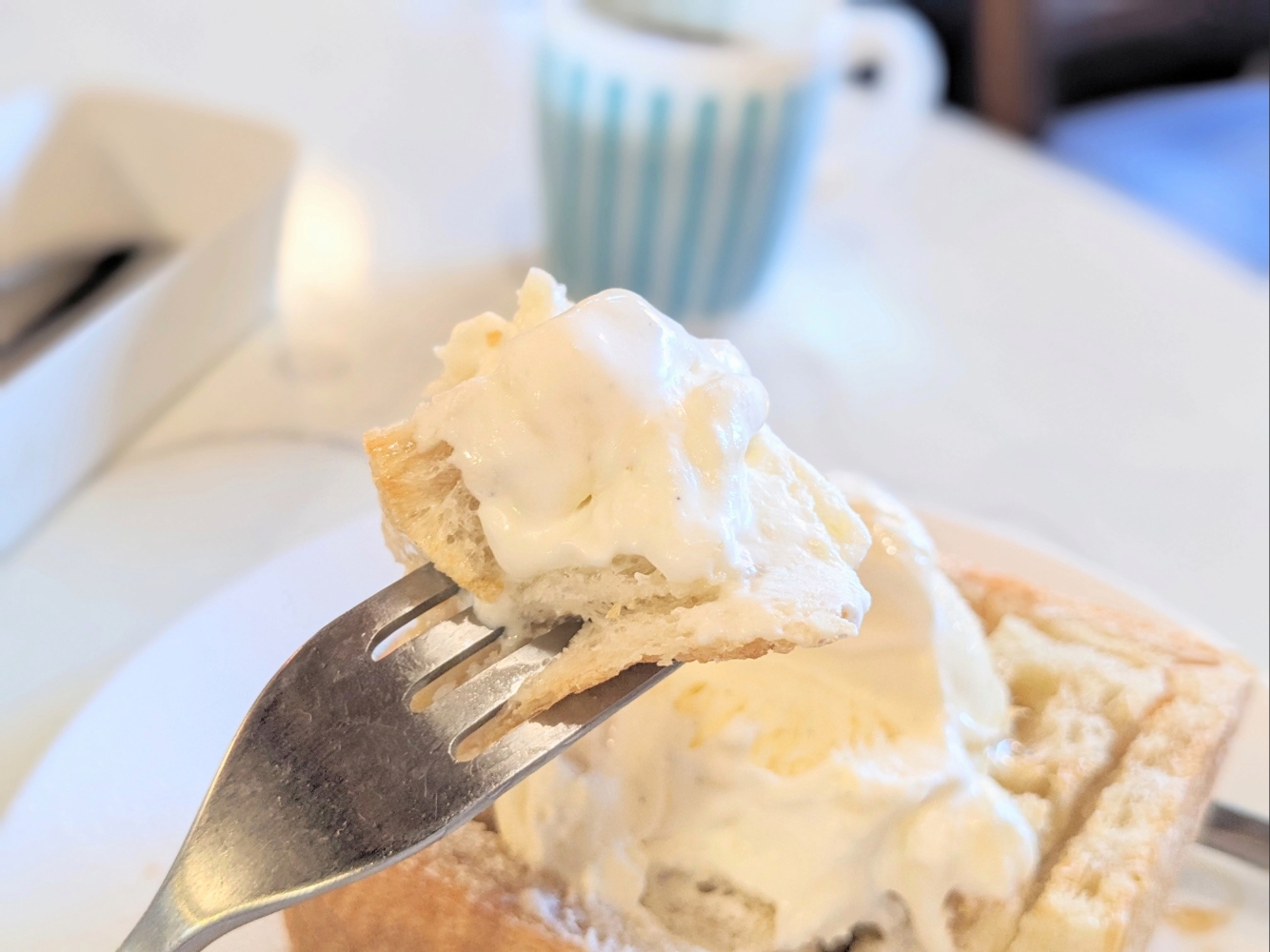 おやつ時にぴったりなのは、超厚切りのハニートースト。店自慢の「もちもち食パンスペシャル」を使い、表面に切り込みを入れバターをのせ、ハチミツをかけてオーブンで焼き上げている。トッピングのアイスクリーム、生クリームが少しずつ熱で溶かされ、切り込み部分からじんわり中に染み込んでいく様子がたまらない。はやる気持ちを抑えてナイフを入れると、ザクッとした手応えがあり、ふわりと甘い香りが舞う。