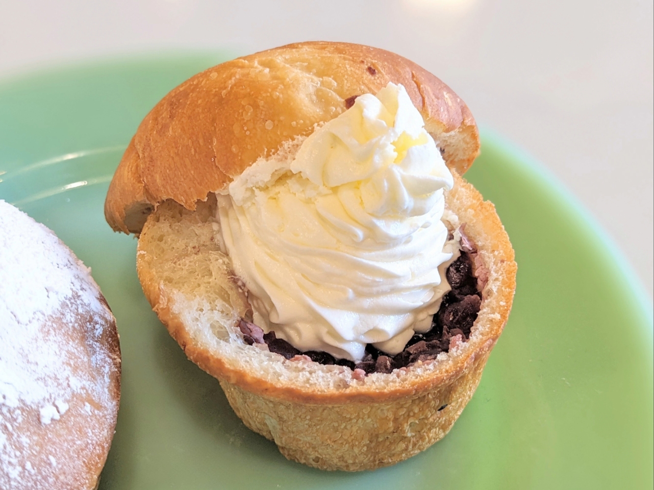 あんぱんの中には、自家製あんこがぎっしり。その上に生クリームを絞った、これもまたインパクトのある一品だ。小豆は、小麦粉と同じ北海道の農家から仕入れたもので、その農家では小豆のさやを一つひとつていねいに手摘みで収穫しているらしい。『nukumuku』のあんこは、その小豆の形を生かしたきれいなつぶあん。口に入れると滋味があふれ、素材の力を感じられる。