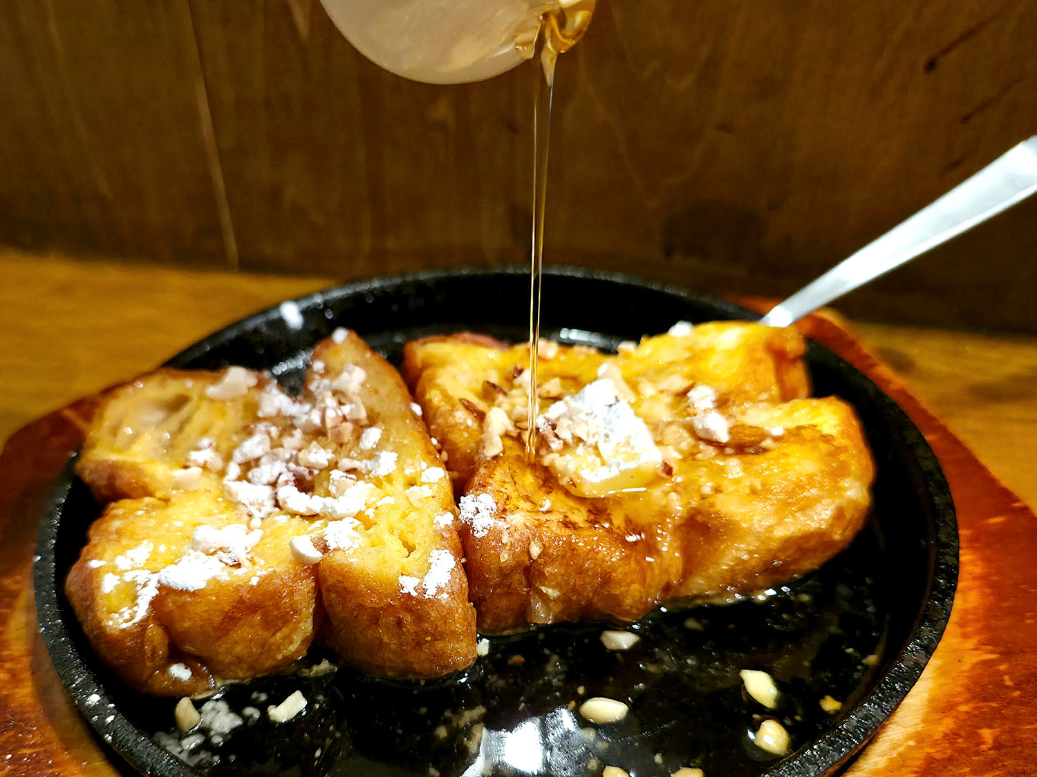 バター、パウダーシュガー、ナッツがトッピングされたフレンチトーストに、メープルシロップが添えられます。